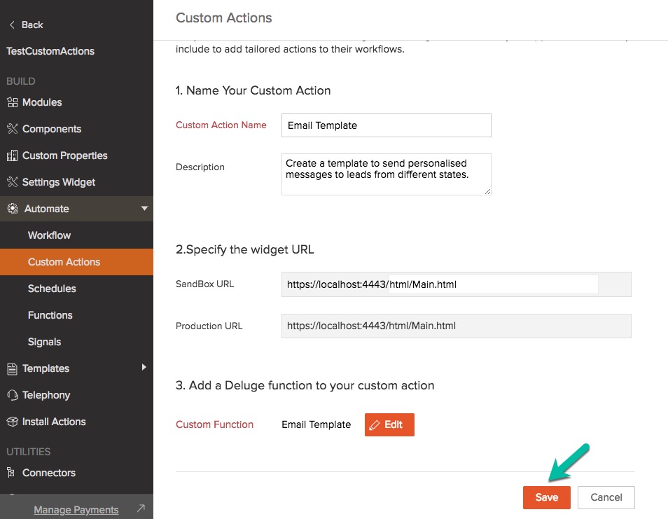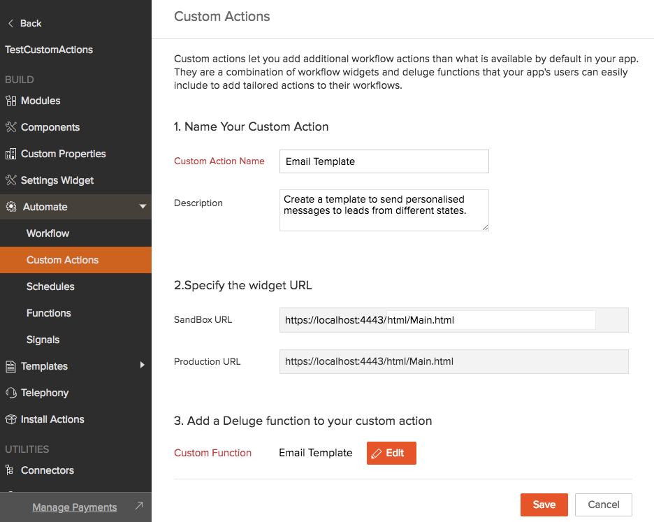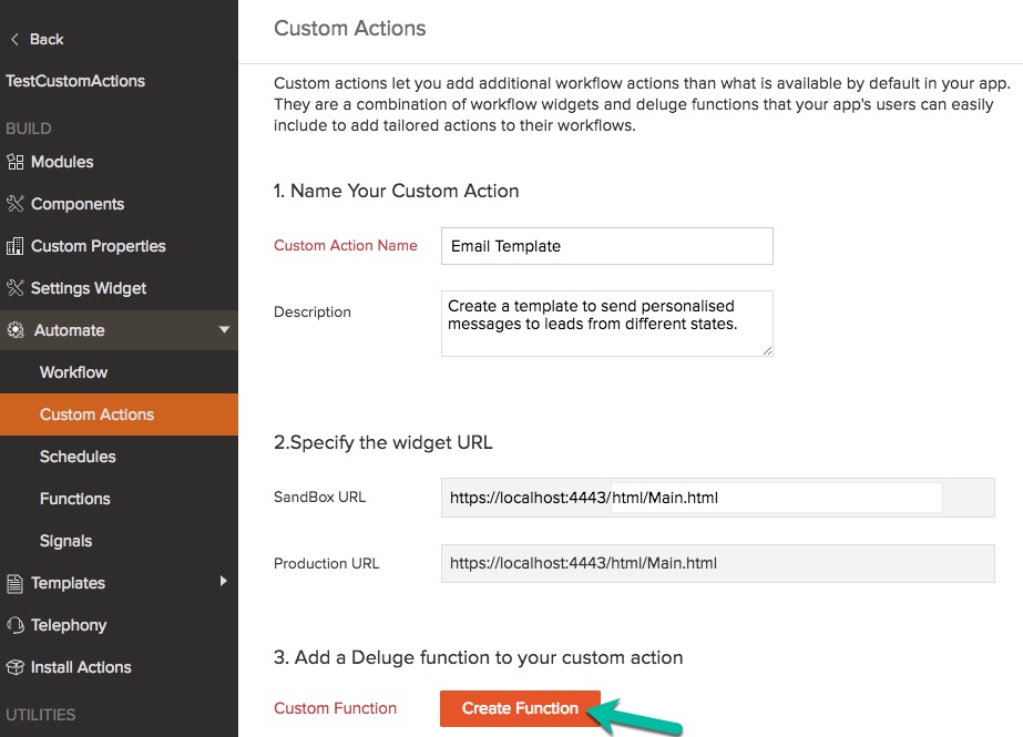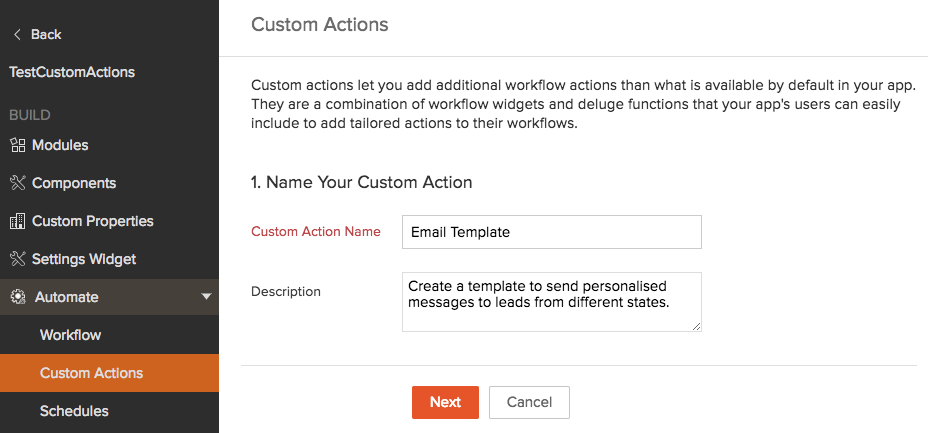 Zoho Developer provides various options to automate repetitive tasks and implement customizations that meet your business needs. These automations and customizations, however, have some constraints in their ability to personalize results for the end user. Consider the example of a CRM for a garage where SMS notifications need to be sent to the customers on three different occasions: the first one welcoming them, the second one to inform them about the estimated cost of service after their vehicle has been inspected, and the final one informing them of their vehicle's service completion date. If a Custom Function is used in this scenario, then three different custom functions need to be written and associated with three different workflows. But if Custom Actions are used, then the same custom function can be used to trigger the SMS messages for all three cases, with the content of the messages decided by the CRM's end user.