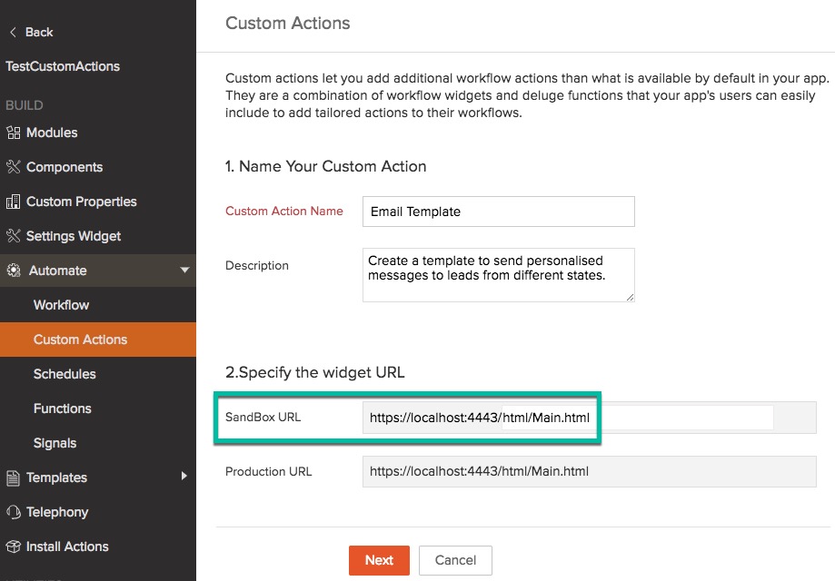 6. Provide the resource path for the Custom Page (Main.html) in the SandBox URL field. This is the relative path to the Custom Page.