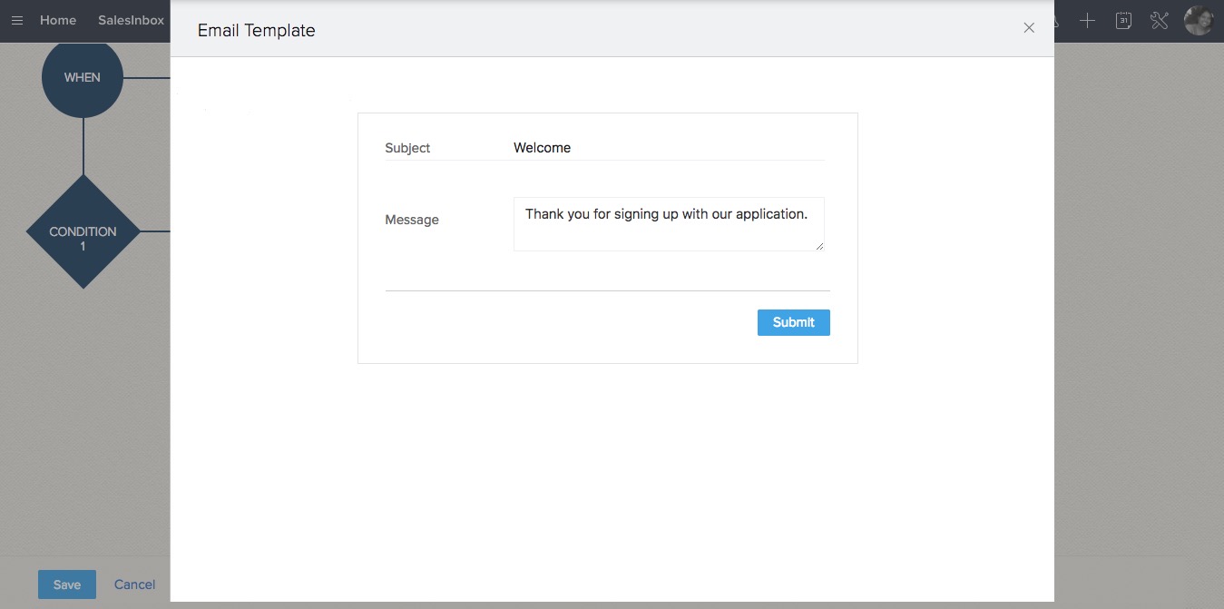 Deluge Script - Reference Guide ) to send an email. This custom function will be executed when associated with a workflow rule. The values from the custom page (Main.html) will be passed as a JSON object to this custom function.