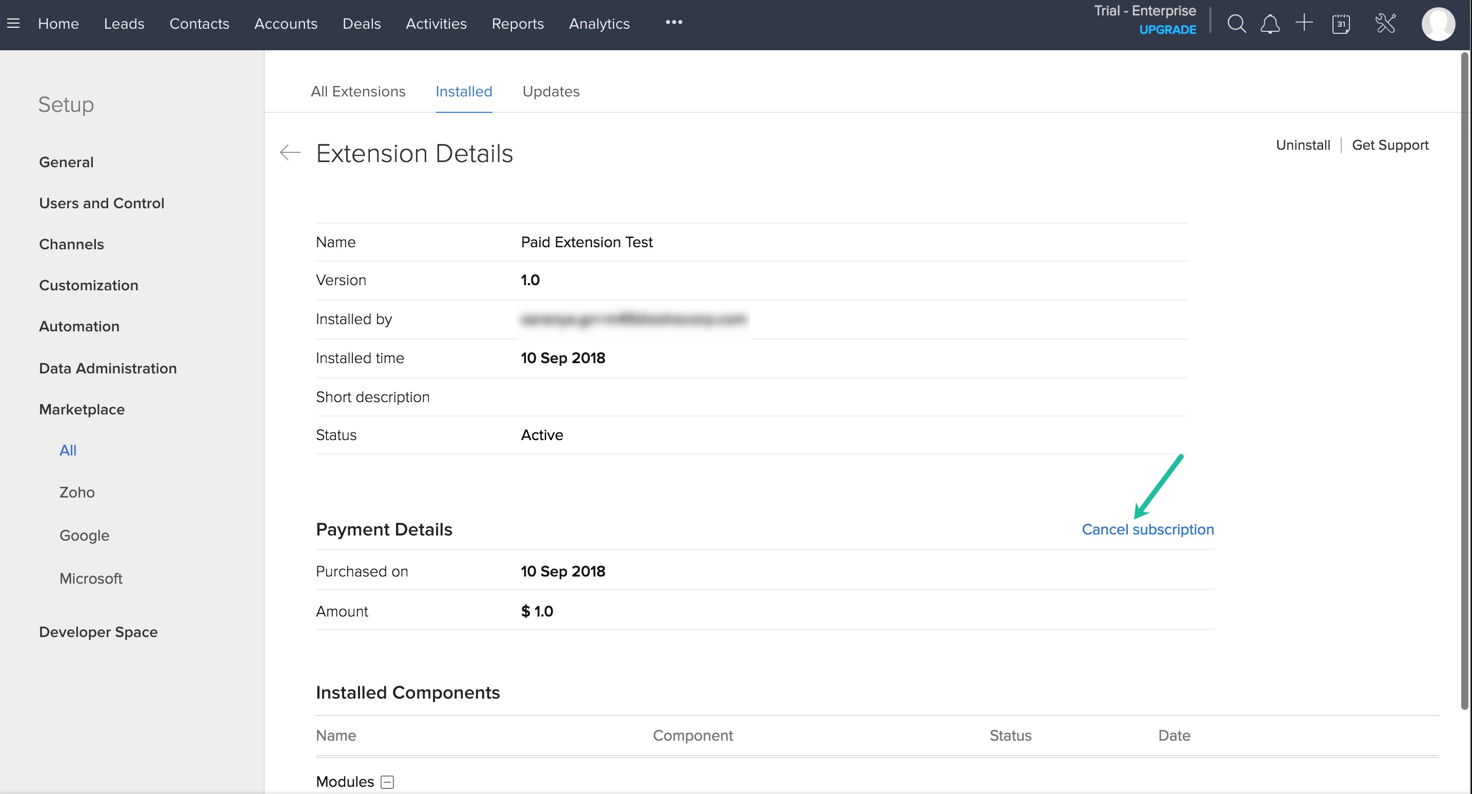 - The end user chooses to leave the paid plan of the extension. The end user does this by selecting Cancel subscription in the Extension Details page (Setup > Marketplace > All > Installed and select the desired extension) in their CRM application as referred to in the screenshot below.