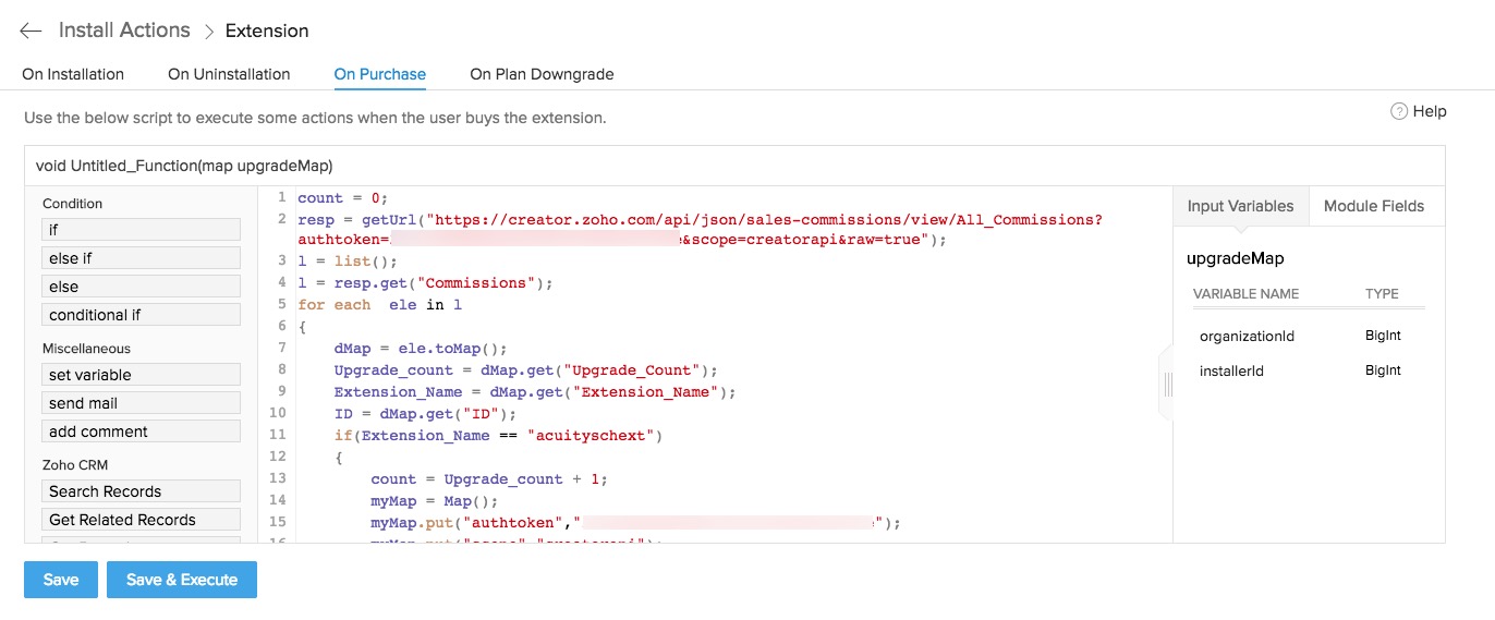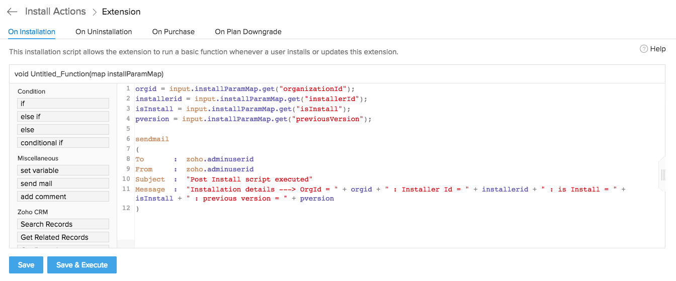 Sometimes, you might want your extension to run a customized script immediately after installation or upgradation. For example, you might want to create sample data, or send an email notification about the installation to the CRM users or to an external system, or kick off a batch operation to populate a new field across a large set of data. This cannot be achieved with the help of a custom function or workflow rules. To help you achieve this, Zoho Developer allows you to bundle a post install script along with your extension.