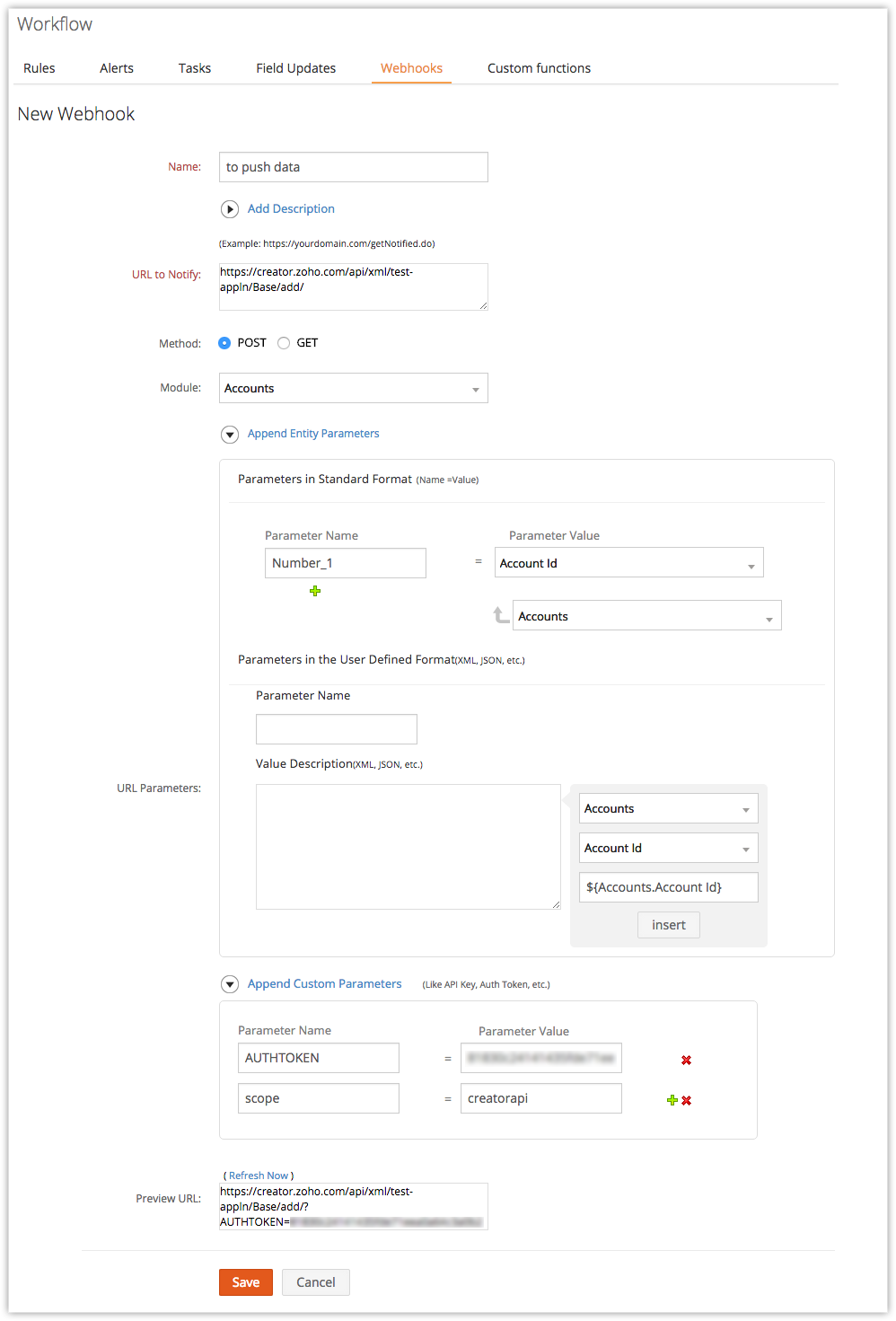 Webhooks facilitates communication with third-party applications by sending instant web notifications every time an event occurs in your Zoho CRM (or Vertical CRM). With Webhooks, you can configure HTTP URLs and associate them in workflow rules to automate the entire notification process. For general information about Webhooks, please refer to