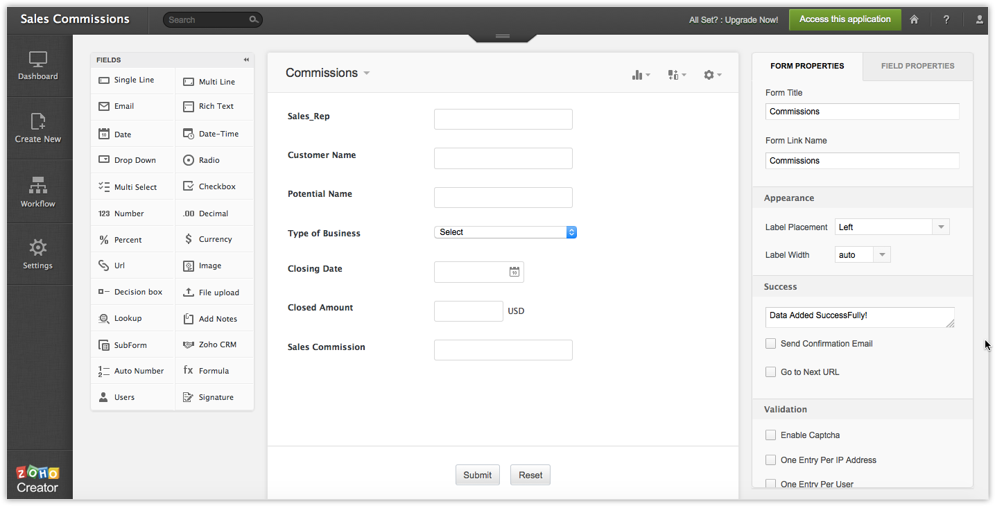 In Zoho Creator, create the Sales Commission App with following fields: