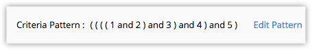 - If you add more rows in the editor and delete one by one there will be additional brackets displayed in the pattern. For example if there are 4 rows added and you delete the 3rd row, the criteria pattern will be as ( ( ( ( 1 and 2 ) ) ) or 3 ). If the first row is deleted then it will be shown as ( ( ( ( 1 ) ) ) or 2 ). However, on saving the criteria, it will change as ( 1 or 2 ).