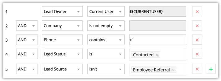 Lead Owner is Current User; Status is contacted; and company name is not empty or phone doesnt contain +91; and source isnt Trade show