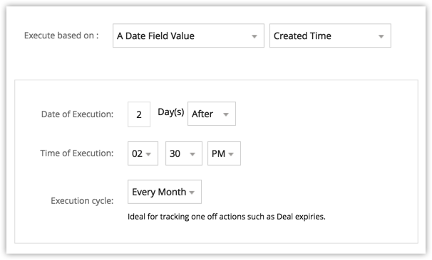 In your industry it may be necessary to send an email reminder to your customers ,a week before a deal's expected closing date, or to send an email to the customers reminding them of the monthly rentals or subscription renewals. In these cases, it is not necessary that the records should be created or edited for the rule to get triggered. It is plainly based on the value in the date fields. This execution option lets you pick a date field from a record and allows you to define the day for the rule to be triggered. Please note, with this option, a maximum of 3000 records will be triggered every hour. If there are more than 3000 records, the remaining records will be executed in the next hour.