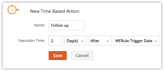 Time Based actions include alerts, tasks, field updates, webhooks and custom functions that are triggered on a specified time after the rule is executed. You can schedule the actions to be triggered based on the Rule Trigger Date, record Created Time, record Modified Time as well as other time or date fields in the module. You can see the list of scheduled actions for individual records under "Upcoming Actions".