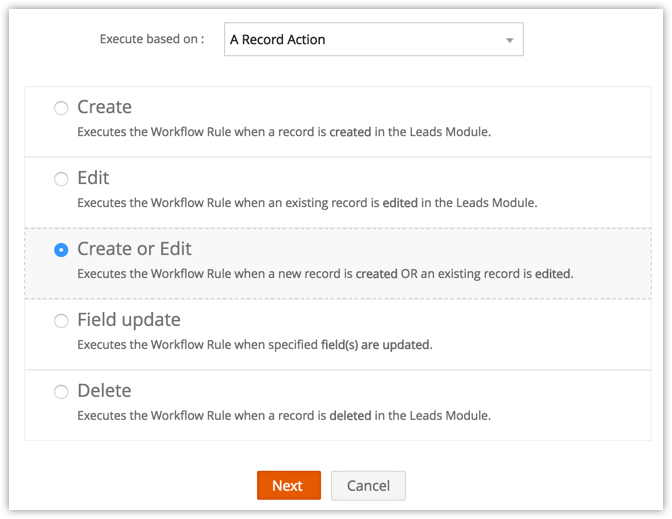When new records are created in your CRM , it may be necessary to automatically send an email or a series of emails at set intervals. You may also want to create tasks for these new records. Also, sometimes when specific fields are updated, you may want to trigger a workflow. This execution option lets you specify an action (Create, Edit, Delete, etc.) based on which workflow rules will be triggered.