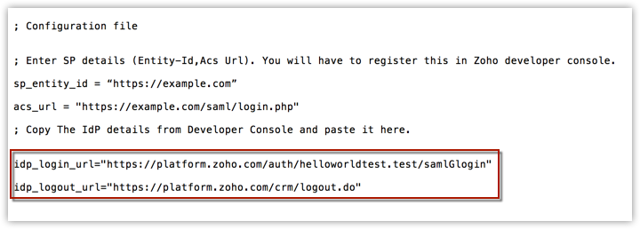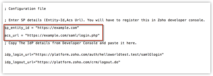 Once you've configured the SAML settings in your application, copy the Service Provider's Entity ID and ACS URL from the Saml_config.ini file and paste it in Zoho Developer Console.