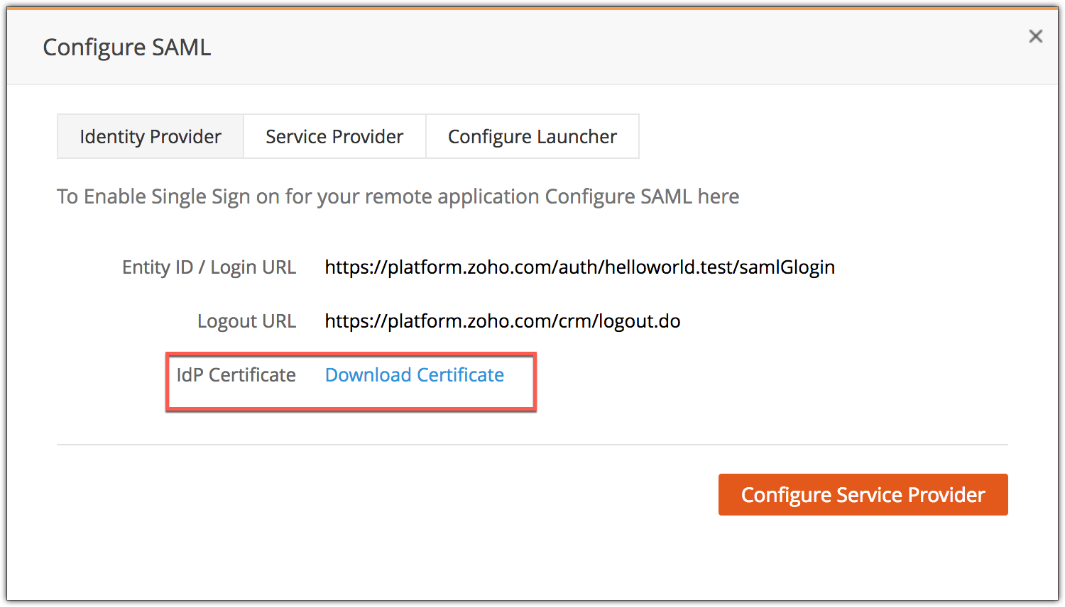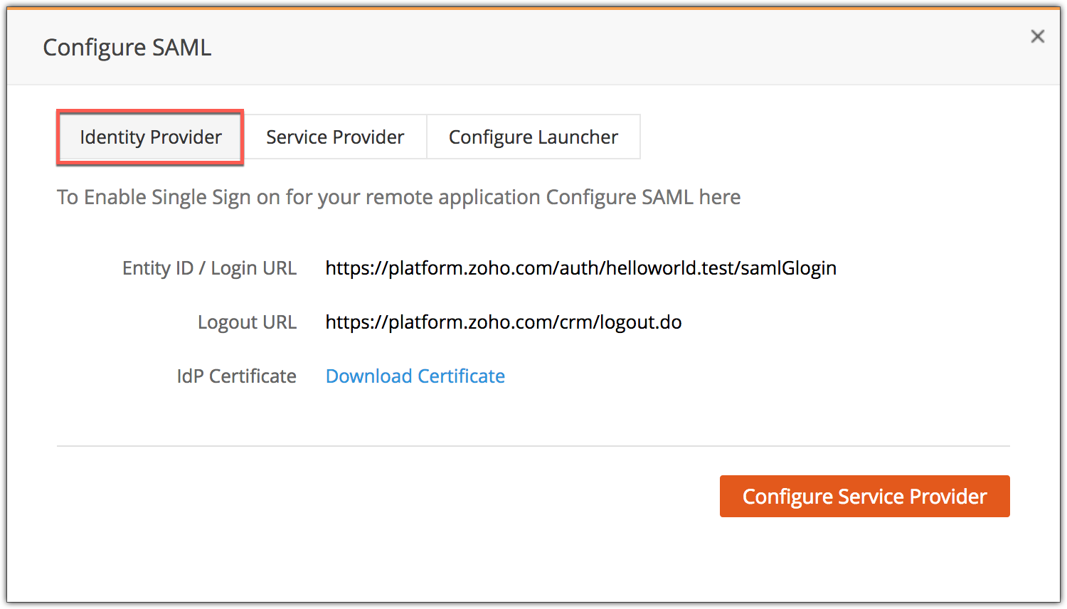 To connect your custom application with Zoho CRM, you will have to configure the SAML Identity Provider details in your application.