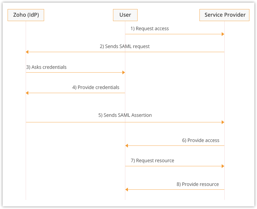 Security Assertion Markup Language (SAML) is an XML-based standard that allows you to exchange authentication data between one service and another. Zoho provides single sign-on for connected apps using SAML. Here, Zoho acts as the identity provider (IdP) and the application is the service provider (SP).