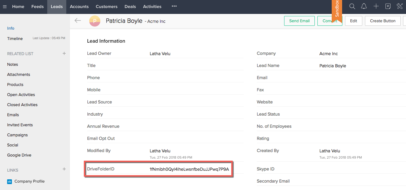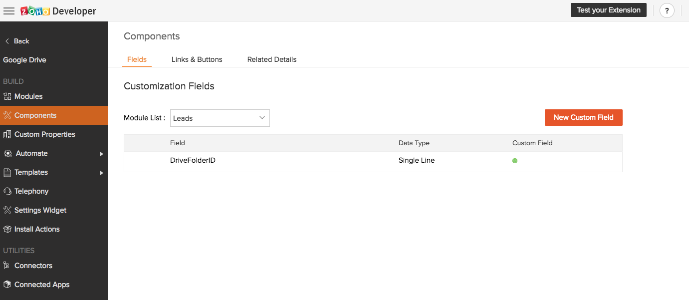 1. Create a custom field named DriveFolderID in the Leads Module to store an auto-generated folder ID whenever a lead record is created.