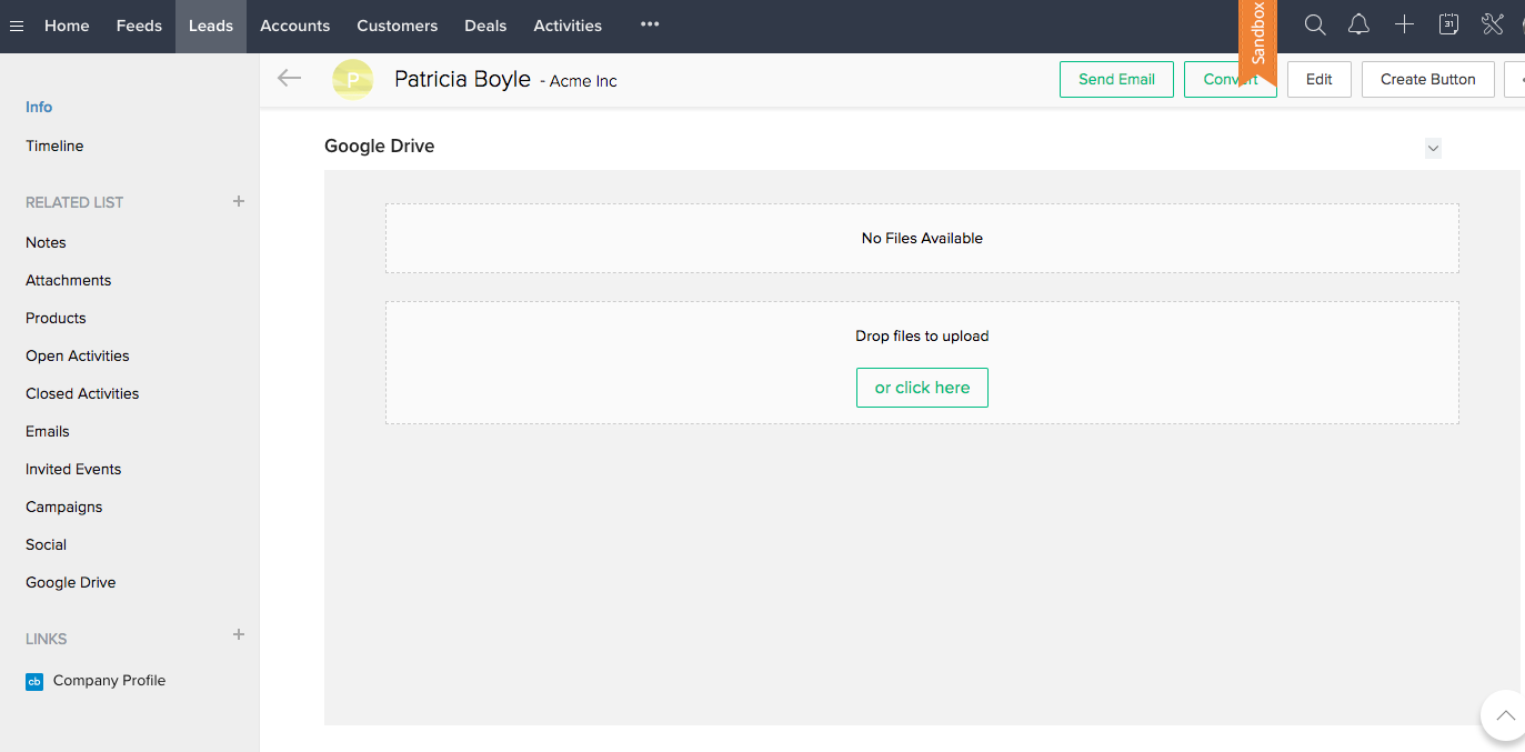 4. Click the Google Drive related list in lead's detail page. No files have been uploaded to the list yet.