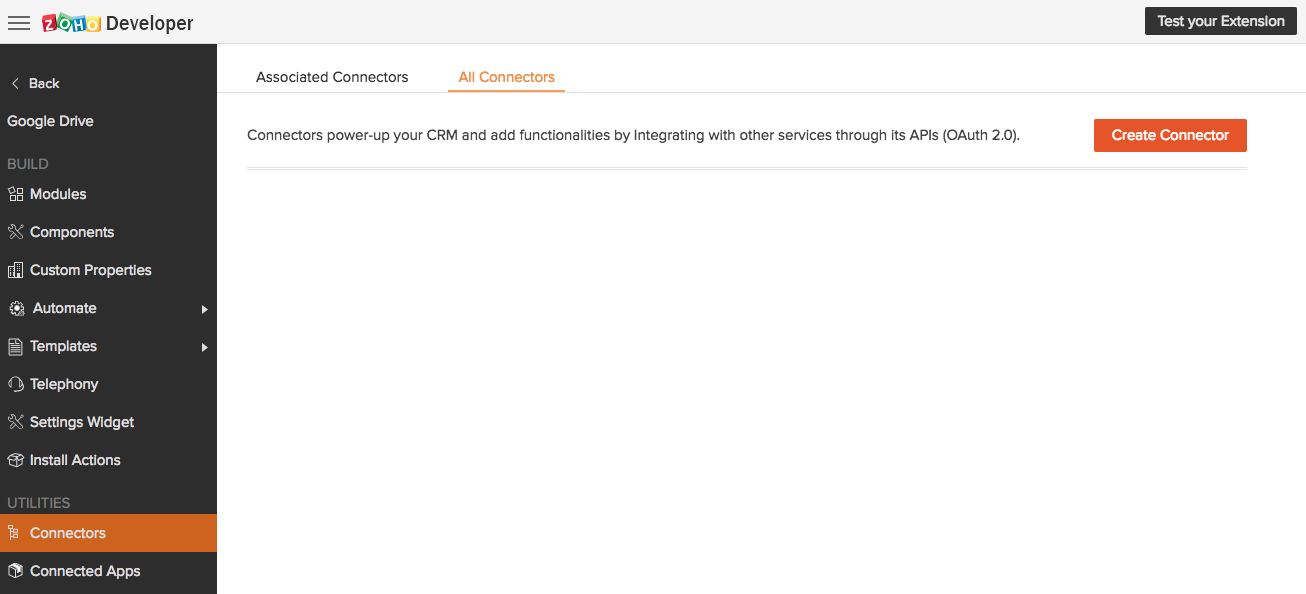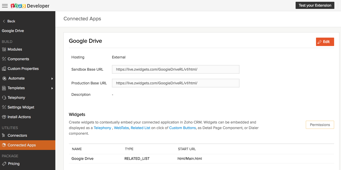 1. Click Test Your Extension located in the top right corner of the Zoho Developer Console.
