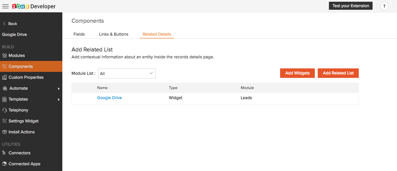 2. Create a Related List titled Google Drive in the Leads module to fetch the files from Google Drive.