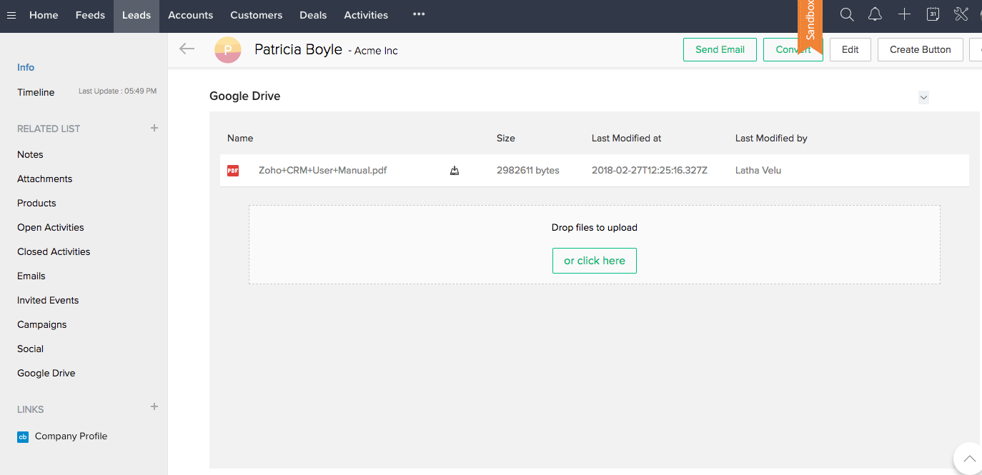 2. Upload any document from Zoho CRM to a Google Drive folder.