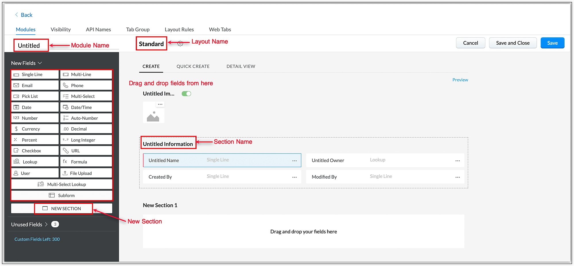 Drag and drop required fields from the New Fields section to appropriate section of your new module. You can rename sections of the module from this Module Builder page.