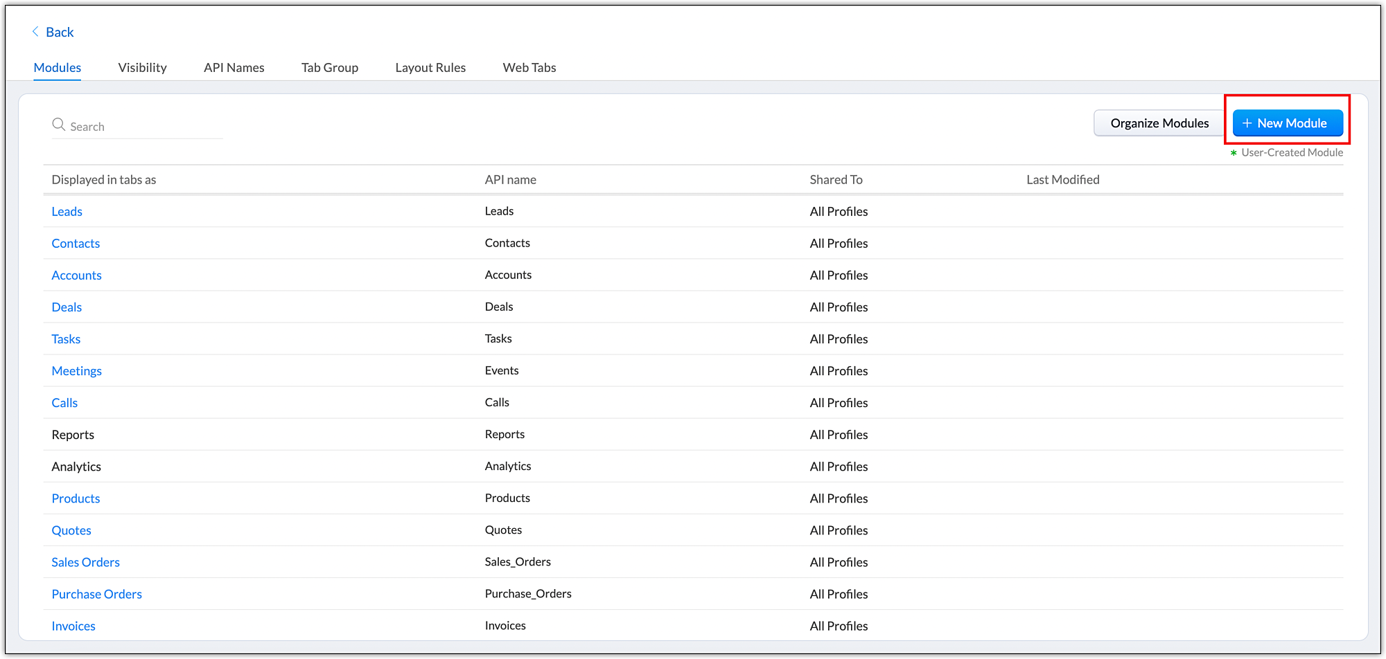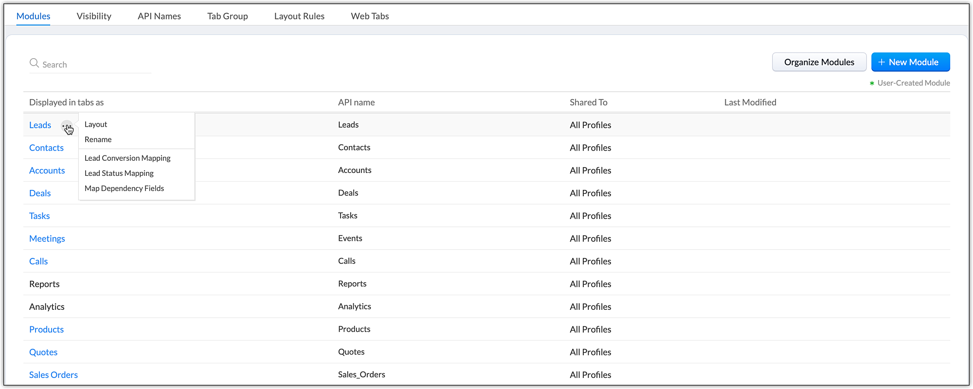 These predefined modules come with a set of default fields and layout. You can edit most aspects of a standard module to suit your requirements. For example, if there is a field called Twitter in the Leads module and you think none of your leads use Twitter, you can remove this field from the Leads layout. Similarly there are many other customization options provided for Standard modules. The customization options and their exceptions vary depending on the module you wish to modify.