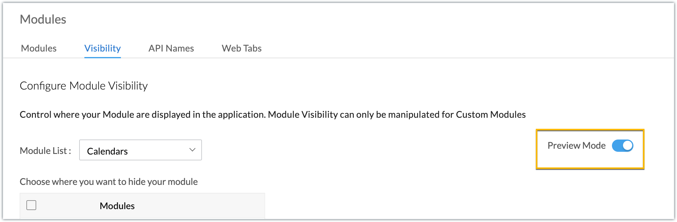 Note: When you enable the Preview Mode option and test the application in a sandbox using the Test your Application button, all of the Visibility page configurations are applied and the developer can test accordingly in the sandbox environment. If it is disabled, the configurations will not be applied in the sandbox environment.