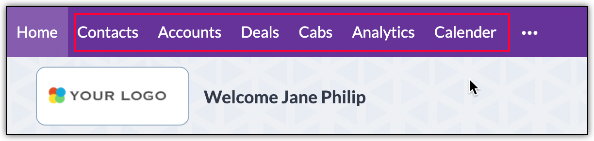 When you log into your solution, the modules are listed in the form of tabs for easy accessibility. For example, in the below image, Contacts, Accounts, Deals etc are the modules. You can switch between modules easily with this arrangement.