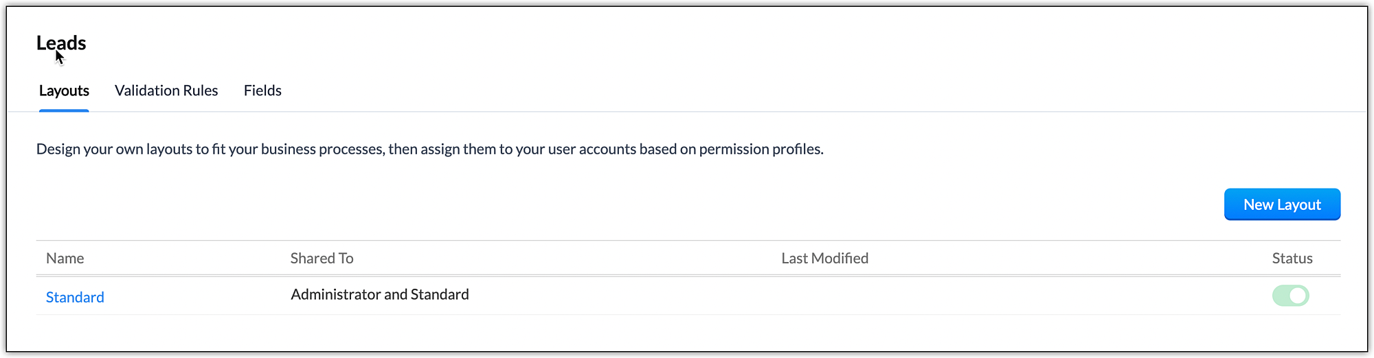 - In the next window, all the layouts already created for the module will be listed down. You can edit the layouts from this window. To create a new layout, click on New Layout.
