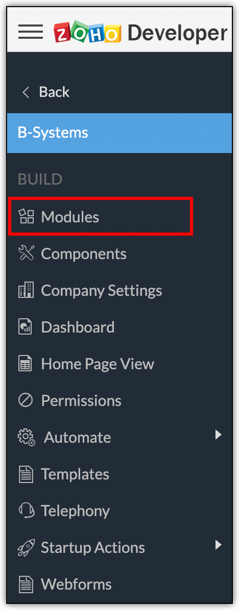 - From the left menu panel, click on MODULES from the BUILD sub-menu.