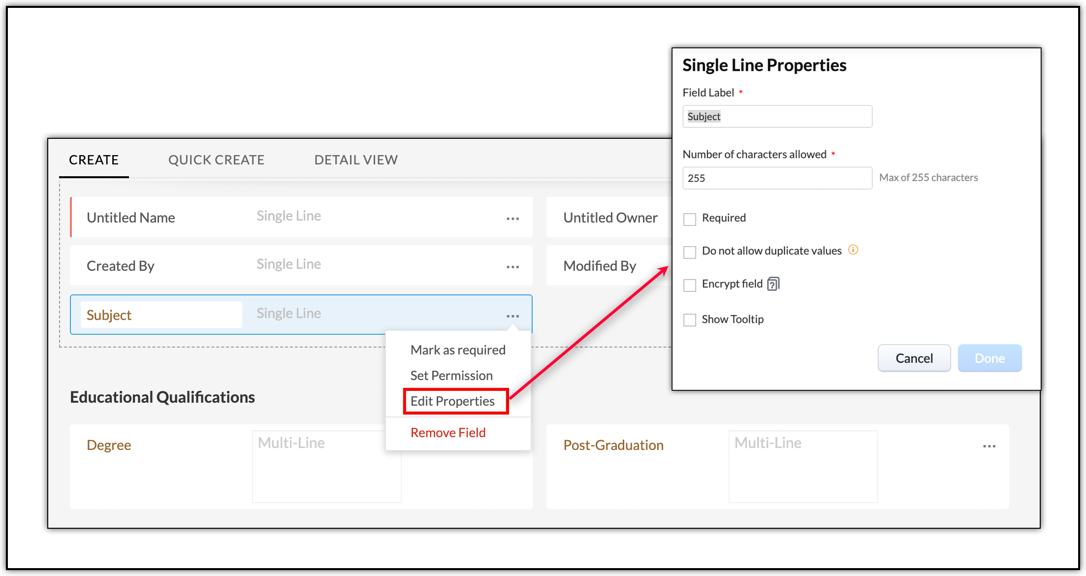 - To edit any field and its properties, click on the ellipsis near the corresponding field. To make the field a mandatory field, select Mark as Required. You can set or edit the Read Write permission for different profiles for a specific field by clicking on the Set Permission option. Edit Properties lets you change the field label and properties. You can also remove the field from the layout by clicking on the Remove Field option.