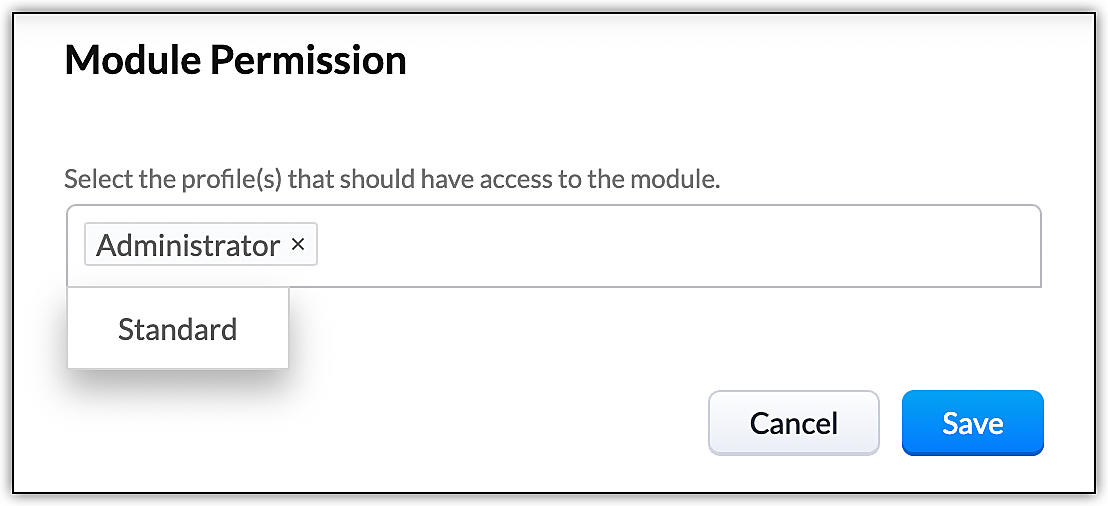 - Upon saving the module, you will be prompted to select the profiles that should have access to the module. Select the appropriate profiles and click on Save.