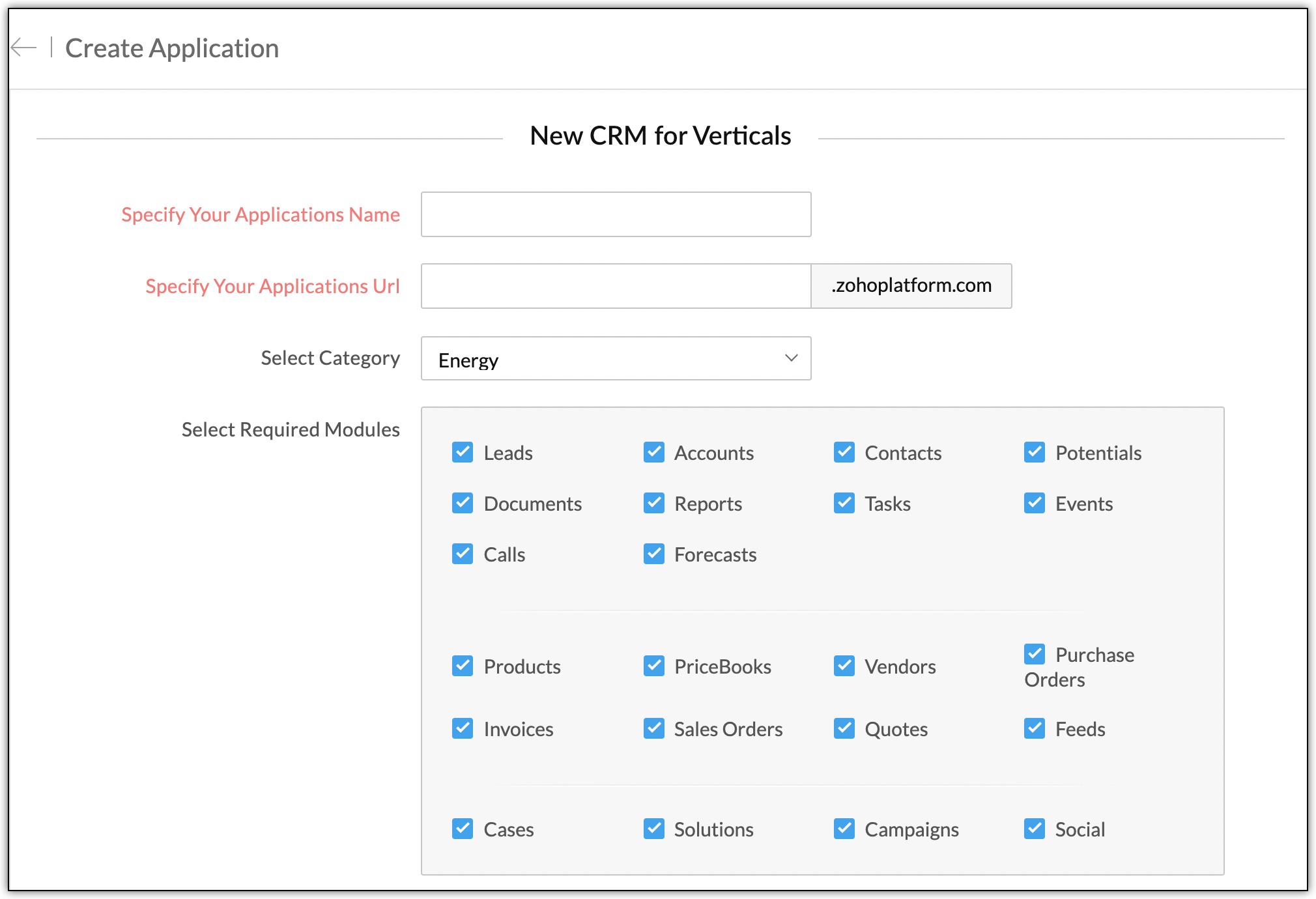 Vertical Solutions provides you with a few standard modules that you can readily use. The standard modules provided are Leads, Accounts, Contacts, Potentials, Documents, Reports, Tasks, Events, Calls, Forecasts, Products, PriceBooks, Vendors, Purchase Orders, Invoices, Sales Orders, Quotes, Feeds, Cases, Solutions, Campaigns and Social.