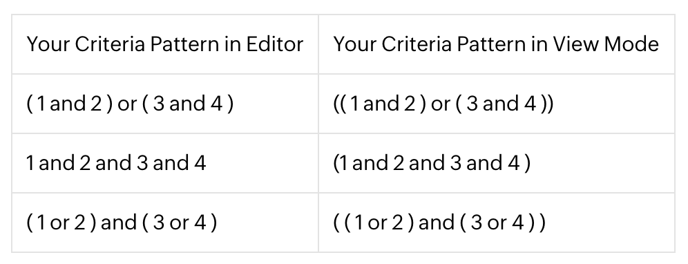 - If you add more rows in the editor and delete one by one there will be additional brackets displayed in the pattern. For example if there are 4 rows added and you delete the 3rd row, the criteria pattern will be as ( ( ( ( 1 and 2 ) ) ) or 3 ). If the first row is deleted then it will be shown as ( ( ( ( 1 ) ) ) or 2 ). However, on saving the criteria, it will change as ( 1 or 2 ).