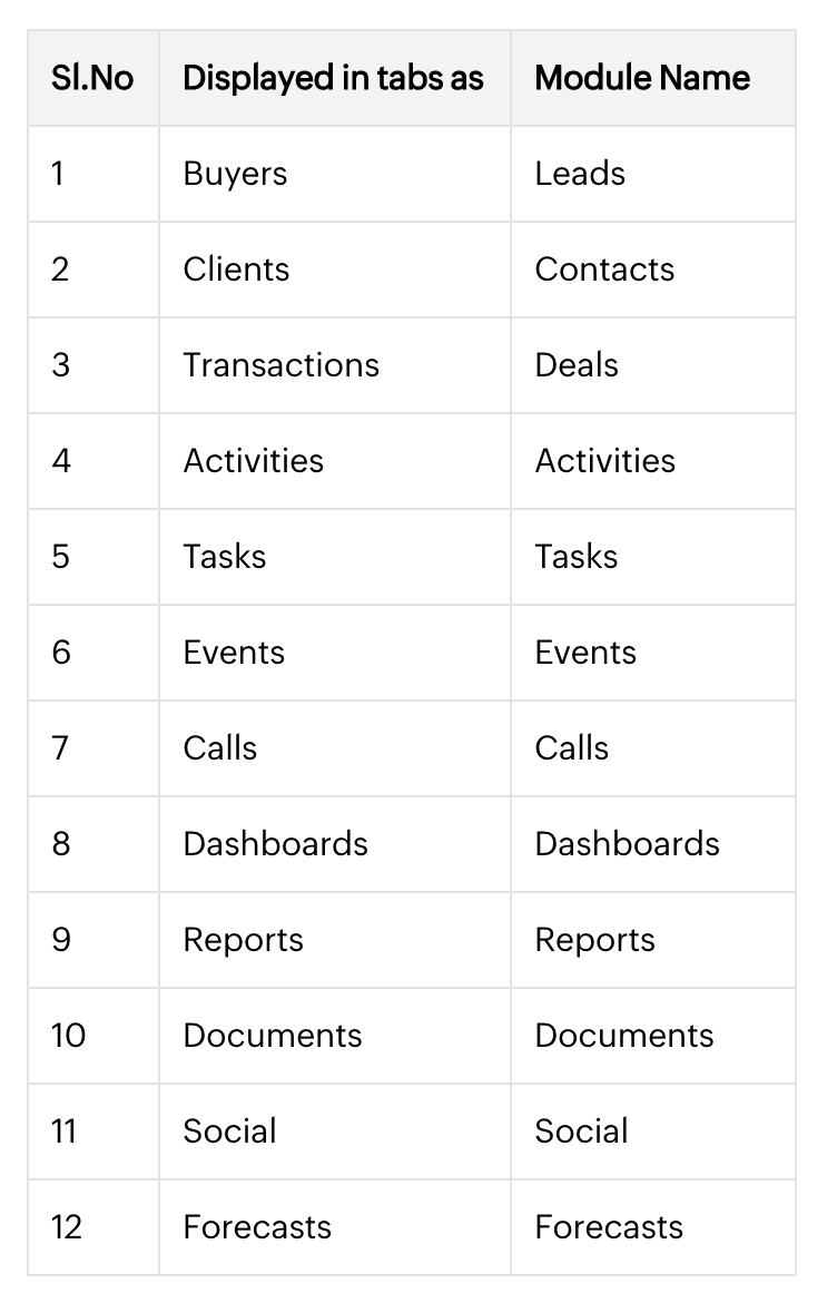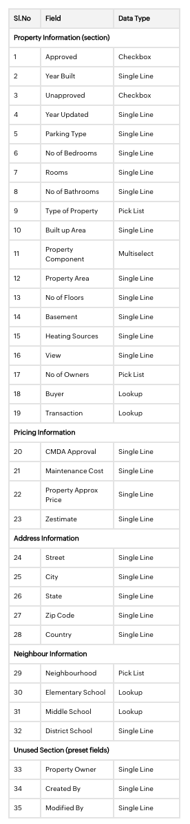 The preset modules can be renamed to suit the real estate lingo and they can be mapped as explained below: