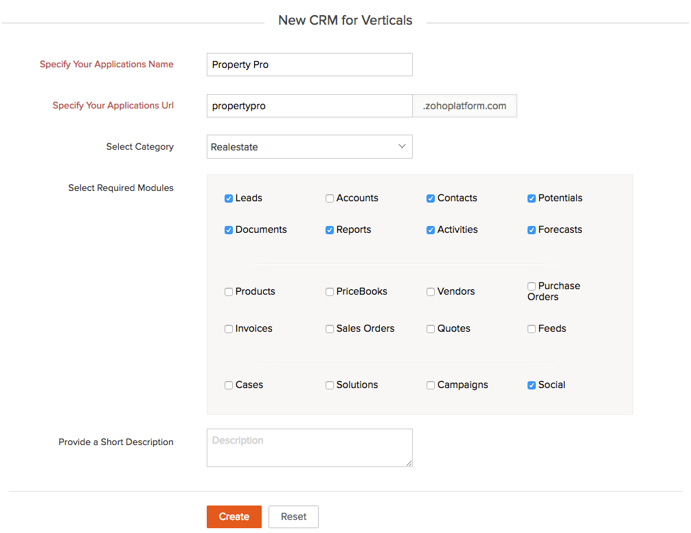 - In the New CRM for Verticals page, input the name of your application, appropriate to the industry, for e.g. "Property Pro" and your URL as "propertypro.zohoplatform.com".