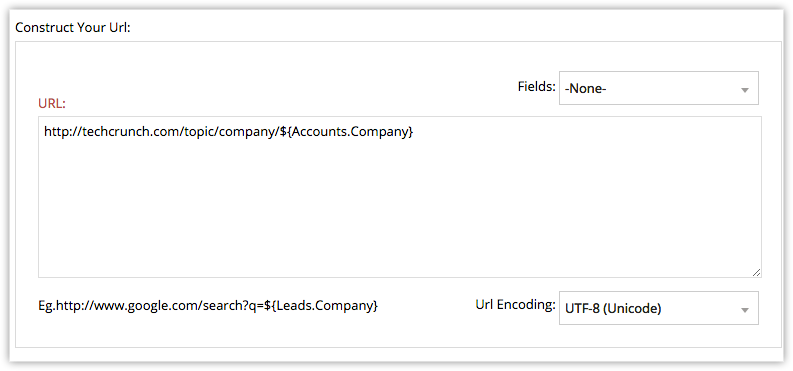 Visit Company profiles of Leads in CRM: You can include a custom field in your contacts module, where your subscribers can specify the Company Name. By creating a URL that is associated with a particular company, they can directly go to the account's company profile by just clicking the custom button (This custom button can be placed while creating, cloning or viewing a record based on your requirements). For example: The link can be: http://techcrunch.com/topic/company/${Accounts.Company}