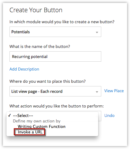 - Create a custom button and choose your button action as Invoking a URL from the drop-down list.