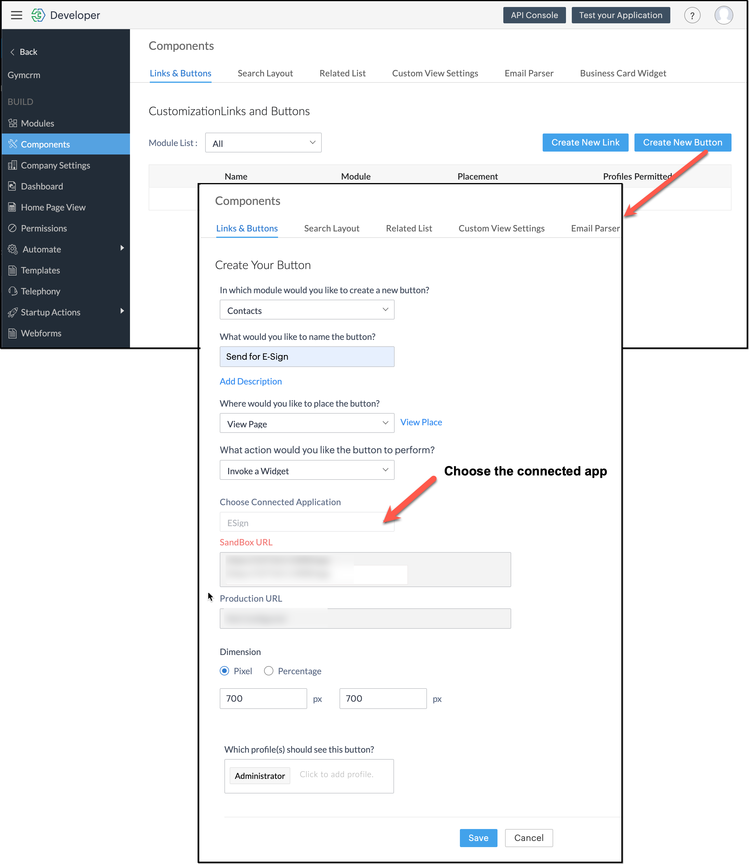 - In the Create Button page, select the module where you want the E-Sign functionality
