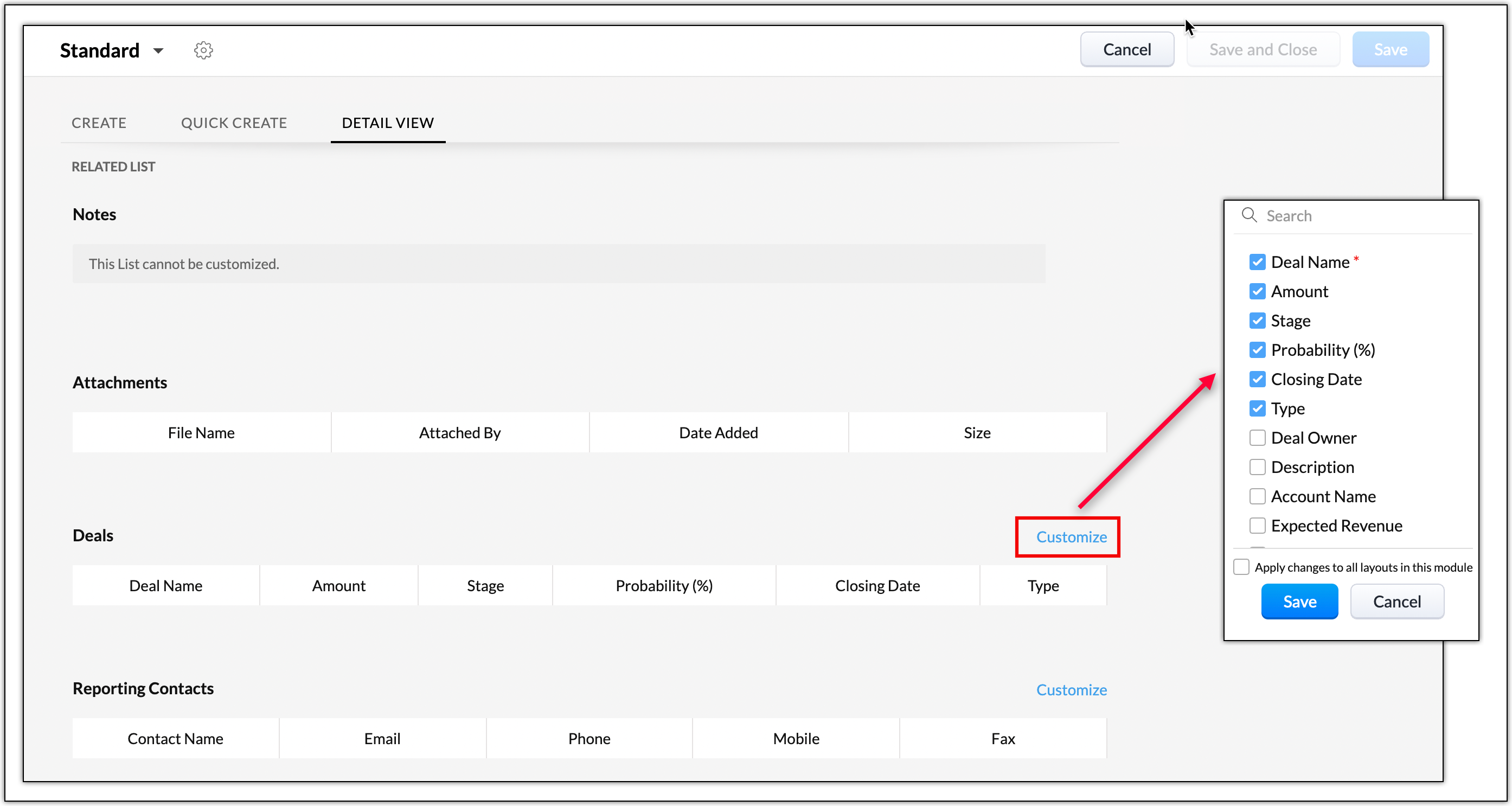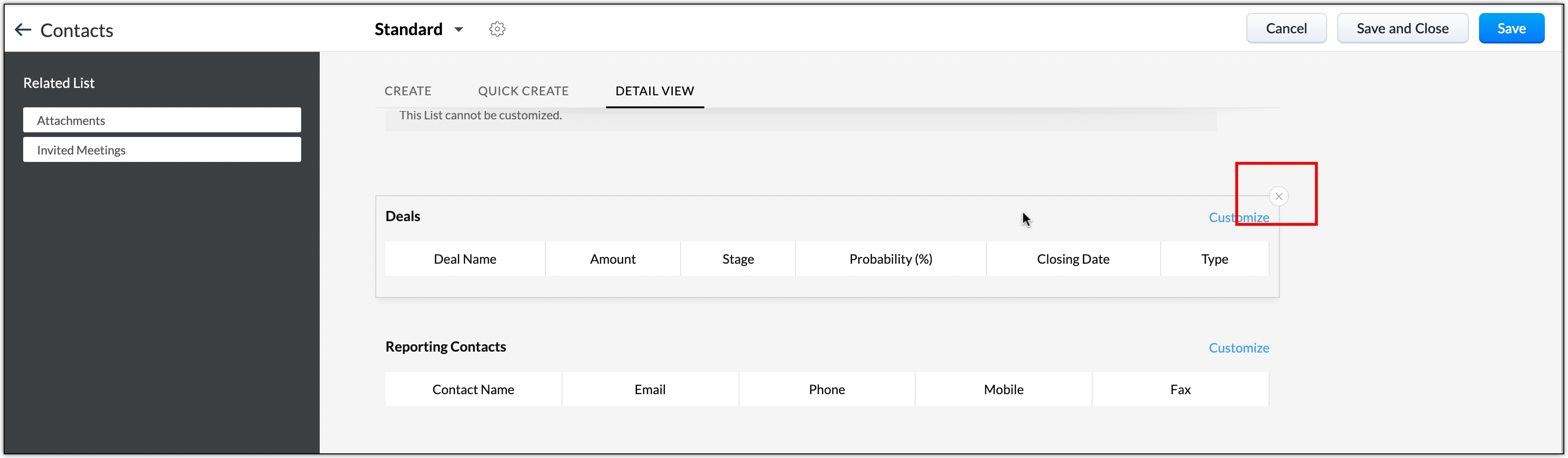 To hide any related list, hover over the same and click on the Close icon. To display any hidden related lists, drag and drop them from the left panel. You can also drag and drop to arrange the related lists in any order you want.
