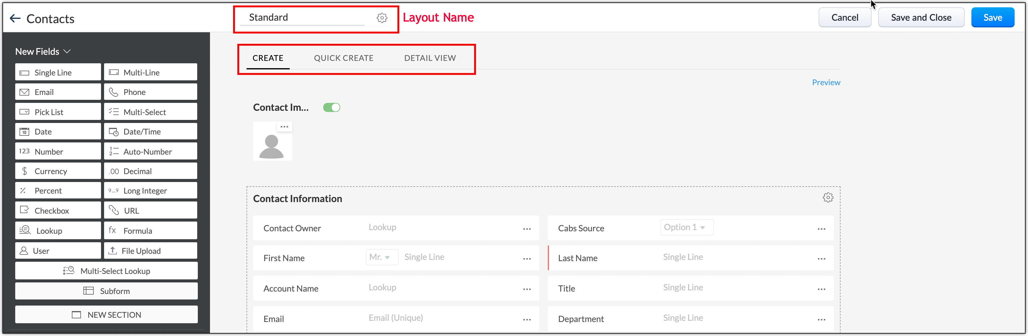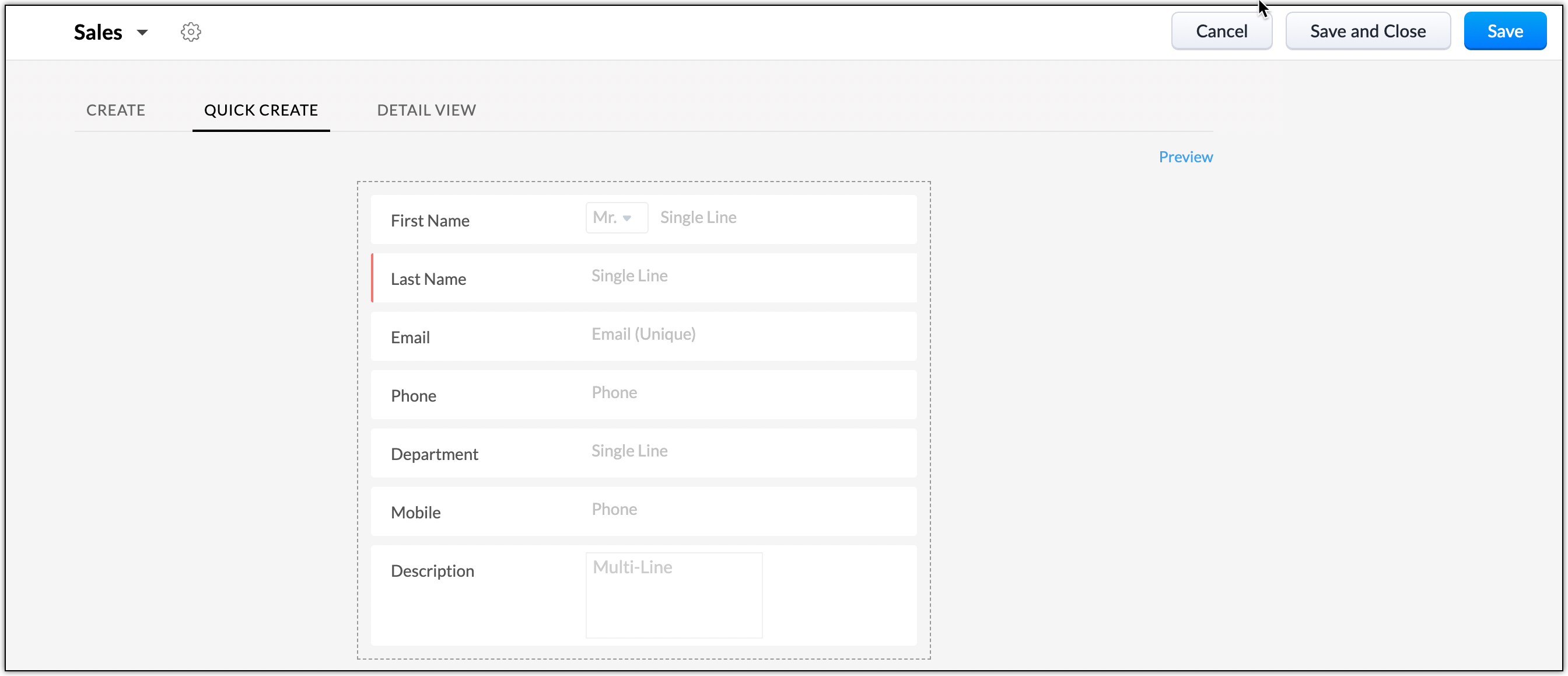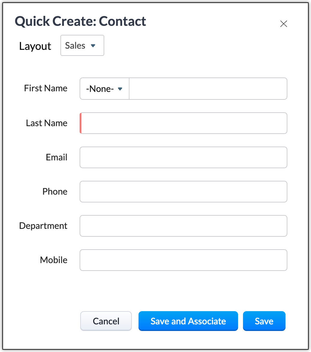 Please note that these Quick Create forms are layout specific, so you can create different forms for different layouts. Let's take an example where the Accounts module has a Contacts look-up field, and the Contacts module has two layouts, Sales and Service. You can create two quick create forms for these two modules, so that each contains distinct fields. When you create a new record in the contacts module via the Create Account (look-up), you can select the appropriate layout (Sales/Service) according to your requirement.