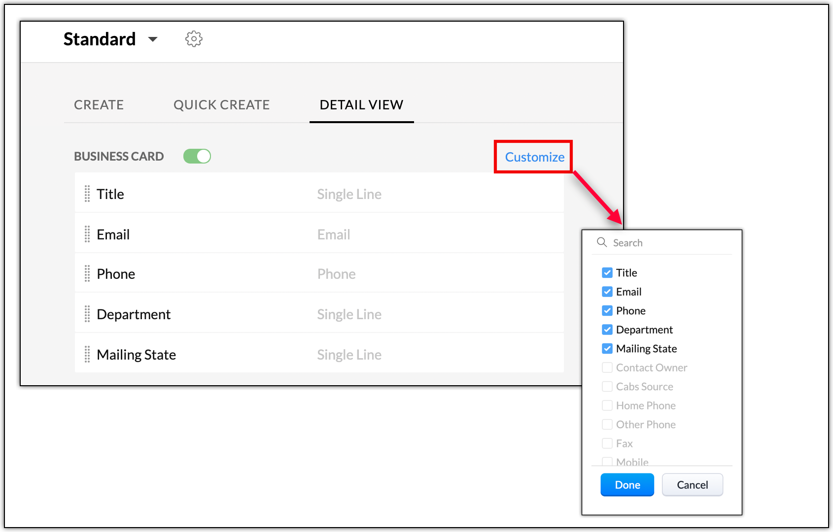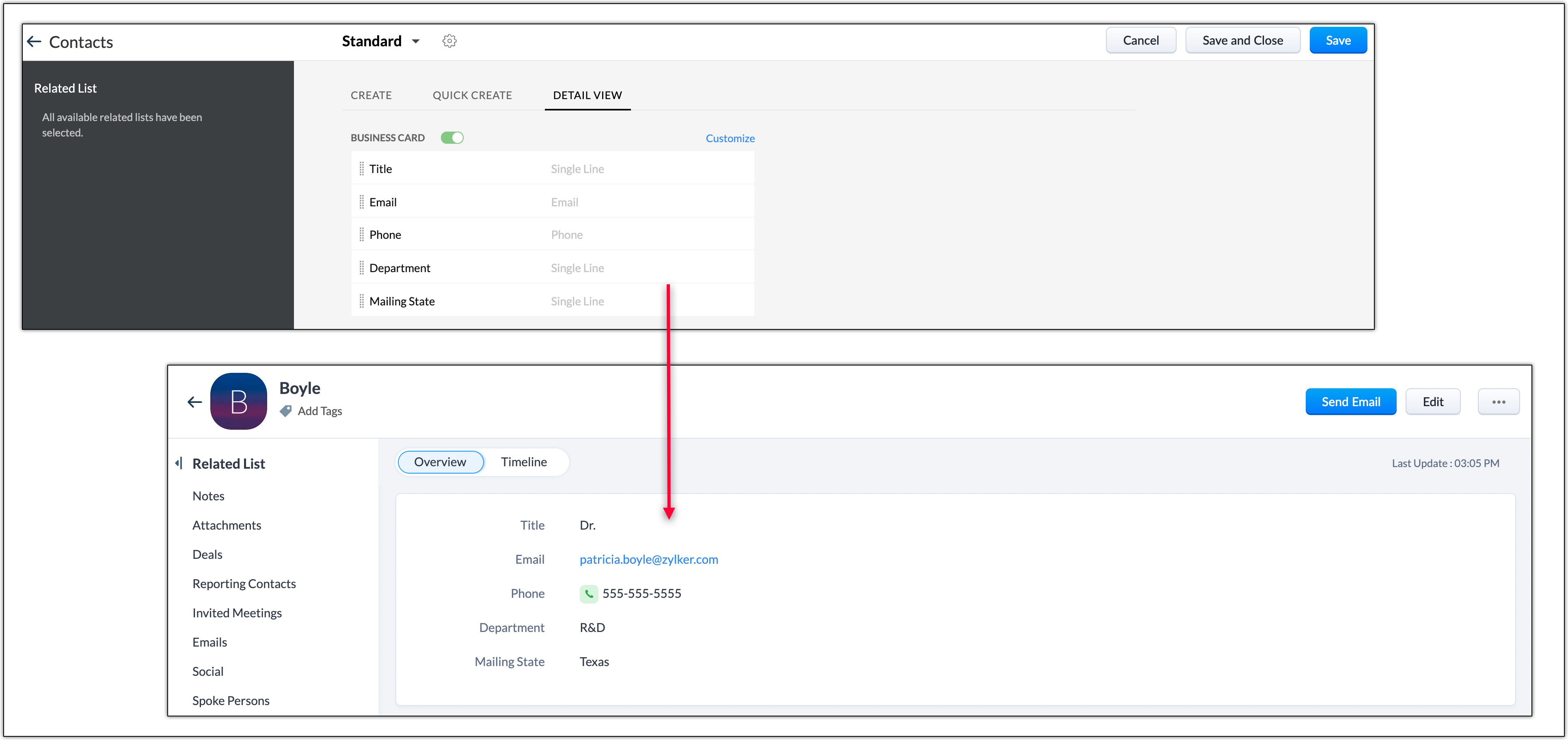 When you open any record in any module, you would want to see the most important fields first. Business card is where you define them. The main elements on a record's details page, such as the record owner, email address, phone number, etc., are quickly previewed in the "business card" view. From the available fields, up to five standard or custom fields can be chosen to appear in the business card. Drag and drop operations can be used to reposition these fields in the order of your choice.