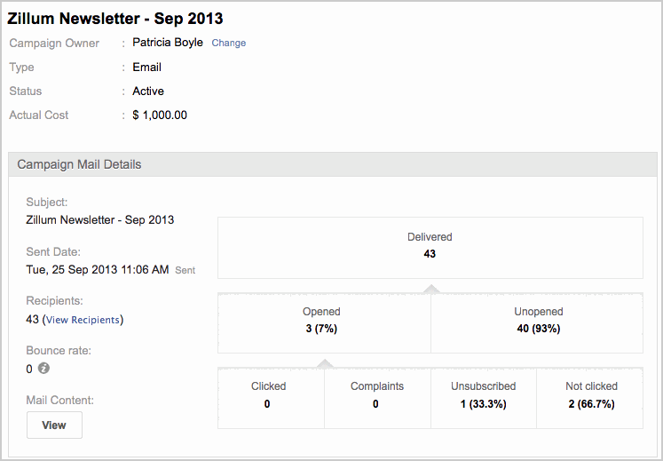 Your customers can send both Email Campaigns as well as Auto responders (Drip Marketing) to their contacts and leads from Zoho Campaigns. After executing email campaign from Zoho Campaigns, they can easily track different types of responses within the CRM's campaigns module. Your customers can drill-down the campaign members and view all status of the past email campaigns. In addition, they can view detailed stats of email campaign without logging into Campaigns.