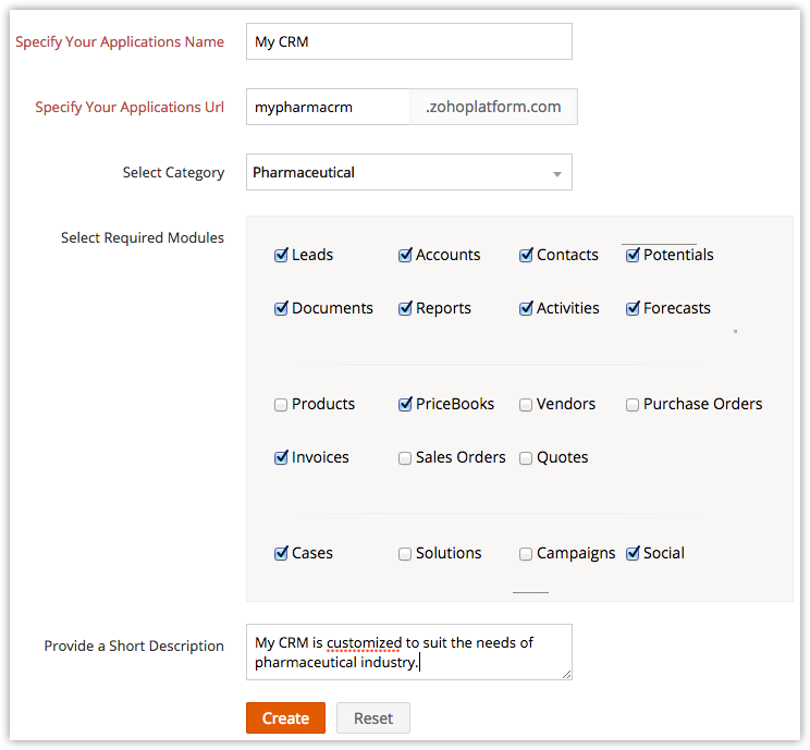 - Build/Customize your solution: You can customize your solution in a variety of ways, such as adding or modifying modules, fields, links, and buttons, set up automation rules, profile permissions, and mail templates. You can also enhance your solution by including other Zoho services such as Projects, Campaigns and SalesIQ as either integrations or extensions to your solution.
