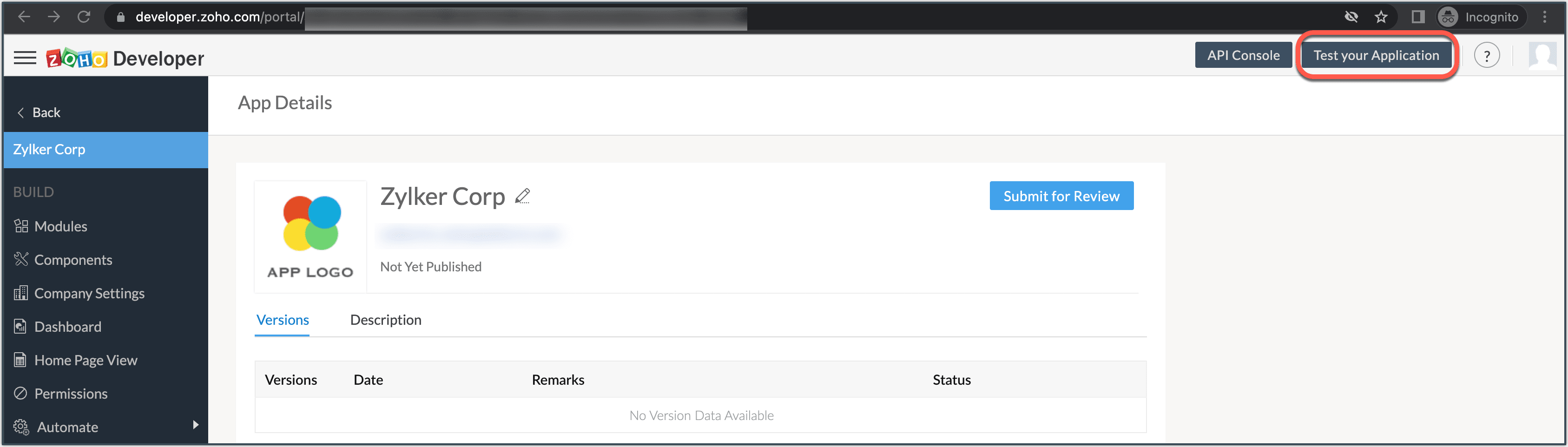 After building and customizing your solution, it is important to test it in a sandbox environment to make sure that your solution is working properly and that your end users will have a positive experience. A sandbox environment acts as a preview to the customizations and configurations that are done at the Developer Console. This allows you to preview how your solution will look and function for your subscribers. To test your application, click on the Test your Application button on the top right of your solution home page.