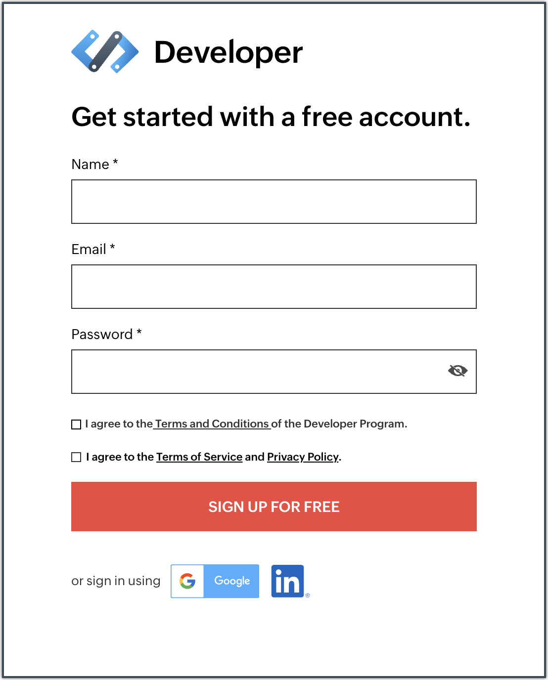 Zoho Developer homepage. Then, enter your name, email address, and a password for your account. You will also need to agree to our Terms and Conditions, Terms of Service, and Privacy Policy. Once you have completed these steps, click on Sign Up for Free. You will be redirected to the Developer home page if your sign-up was successful. Alternatively, you can also sign up using your Google or LinkedIn account.