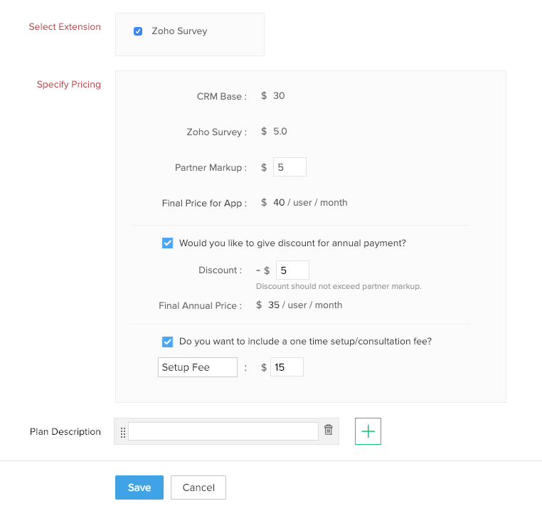 - Specify the price of this plan including the Partner Markup. Select the extensions you want to include in the pricing; the price of the extension is added to the total price of the Vertical solution. You can also include a discount (for the users paying on annual basis) and a one time setup/consultation fee.