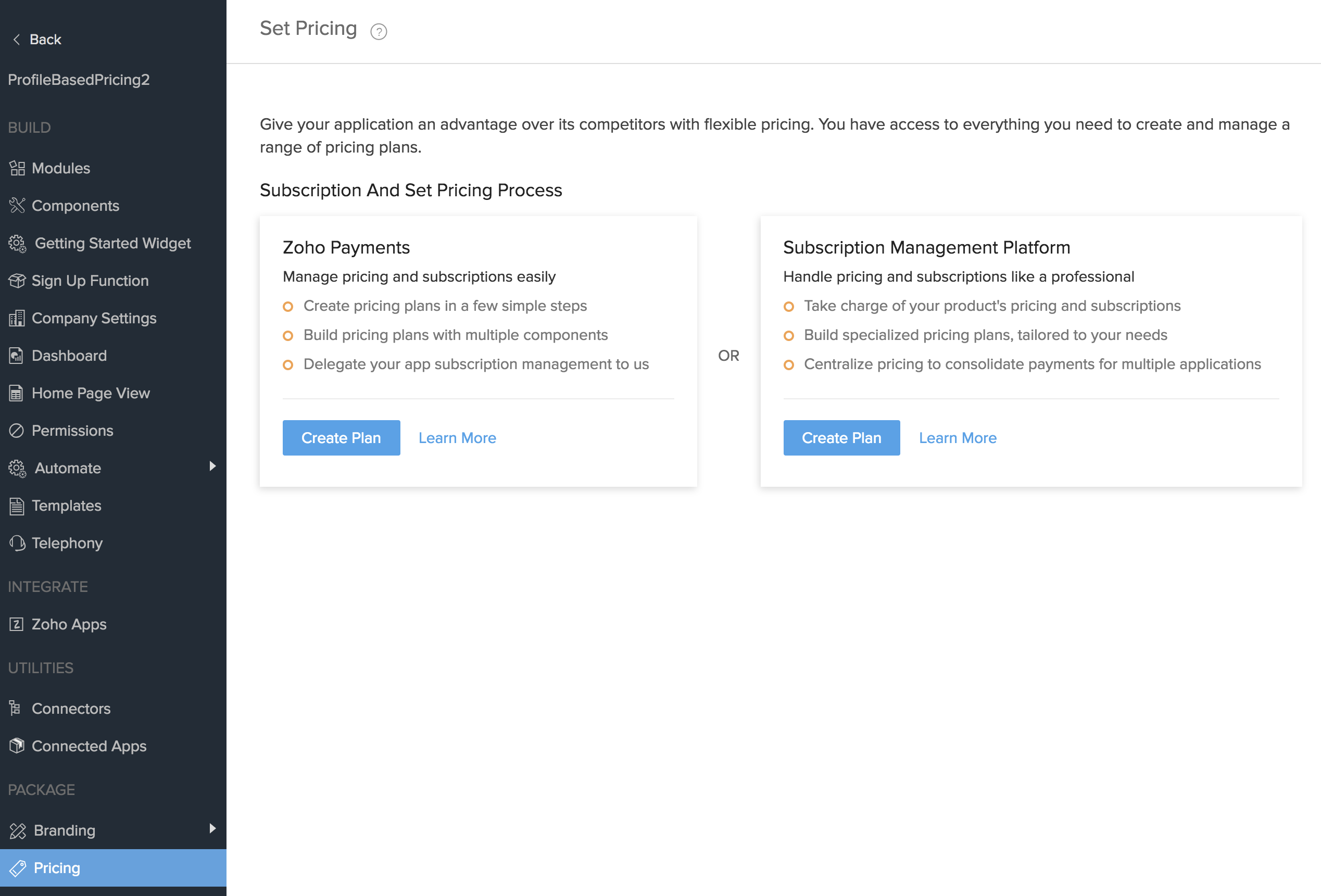 Pricing your solution is a very important step, as the price you set will have a significant impact on the success of your solution. There are no restrictions on the features that will be available for your solution. All the solutions that you create will have features and functionalities available in the Enterprise version of Zoho CRM, with some exceptions. You can limit the number of modules that will be available to your customers based on the plan they choose. You can create upto three plans per solution, with different prices.