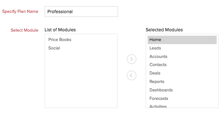 - From the List of Modules list box, select the modules that must be available for the users of this plan and move it to Selected Modules list box.