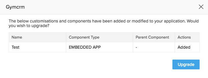 - Click the Upgrade button for the customer whose solution you want to update. On clicking the Upgrade button, a dialog box with the details of the latest changes will be displayed.