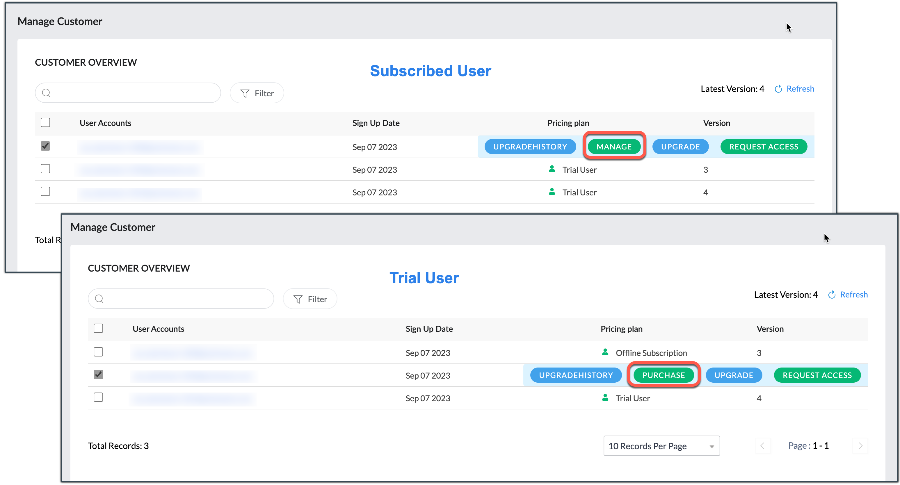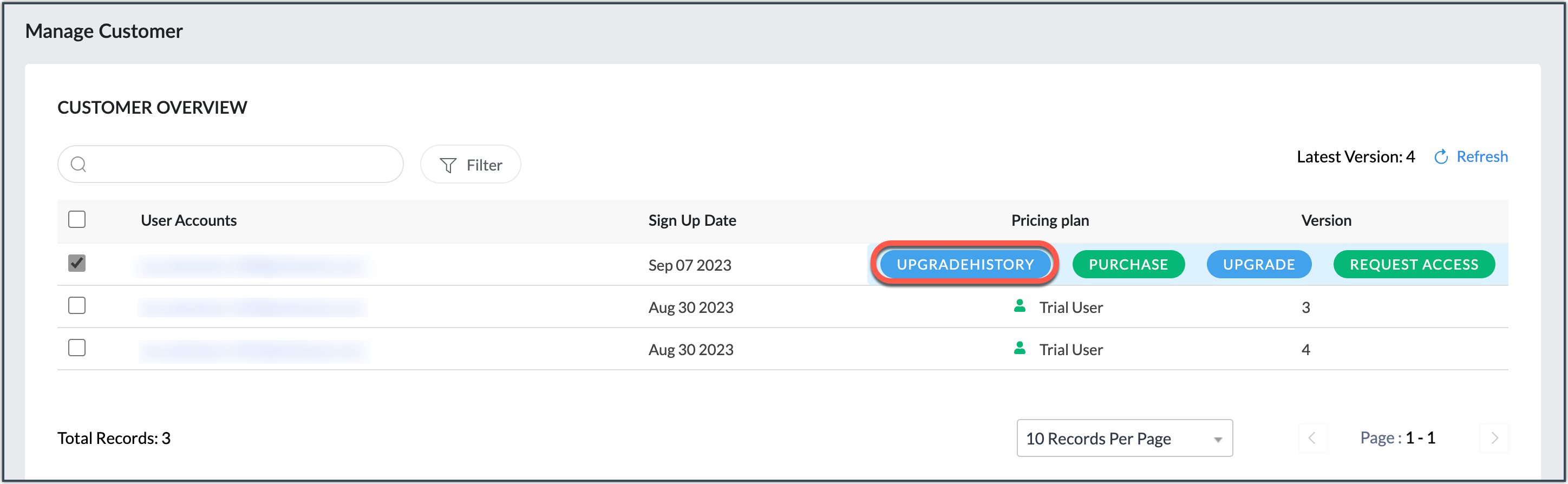 - In the Manage Customers page, select the customer whose upgrade history you want to view.