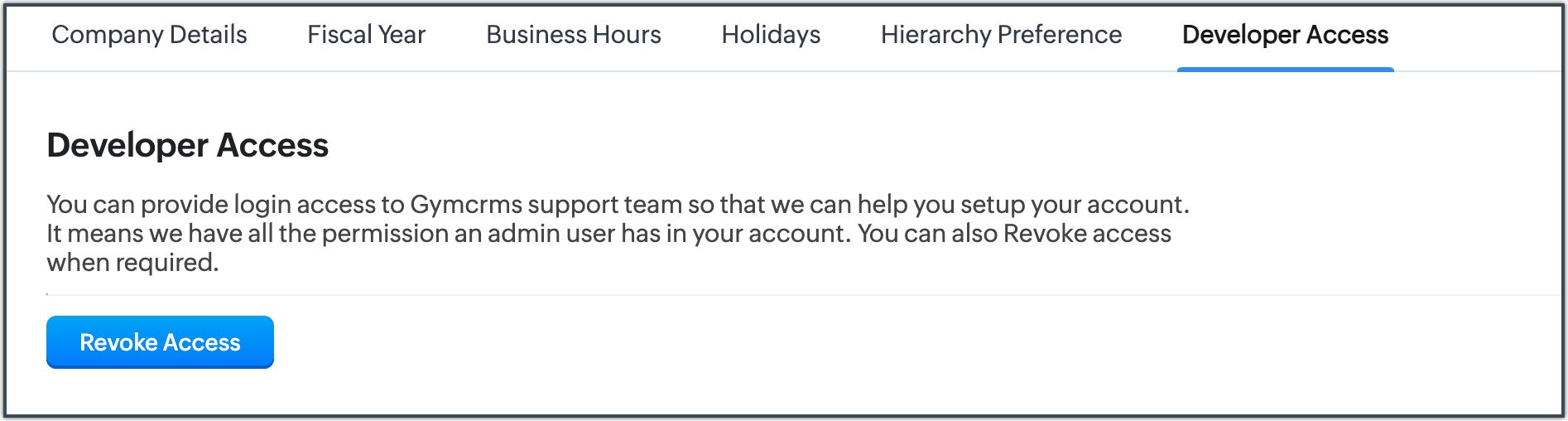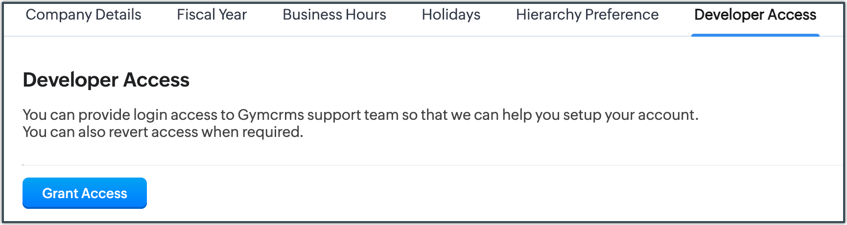 Developer Access enables the customer to provide you with access to their solution without sharing their credentials. This is useful when you need to help them configure complex business workflows or add custom automation logic specific to their account. The developer will have full Admin privileges on the customer's account thereby having access to all the customization and data. This access will remain active until the end user explicitly revokes it.
