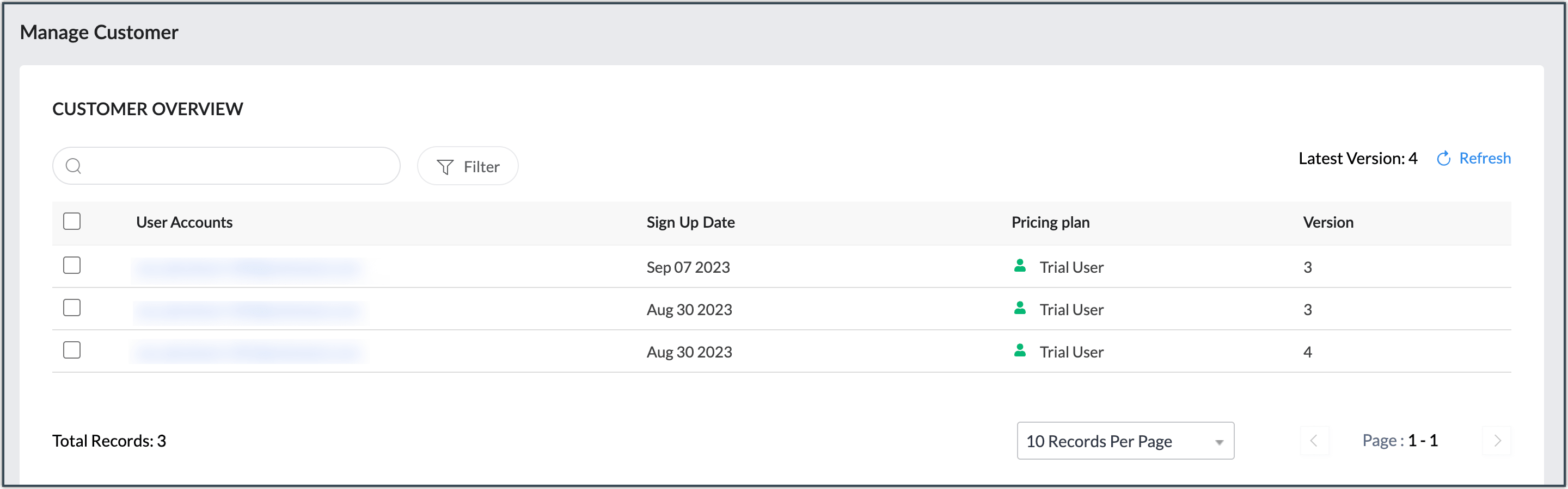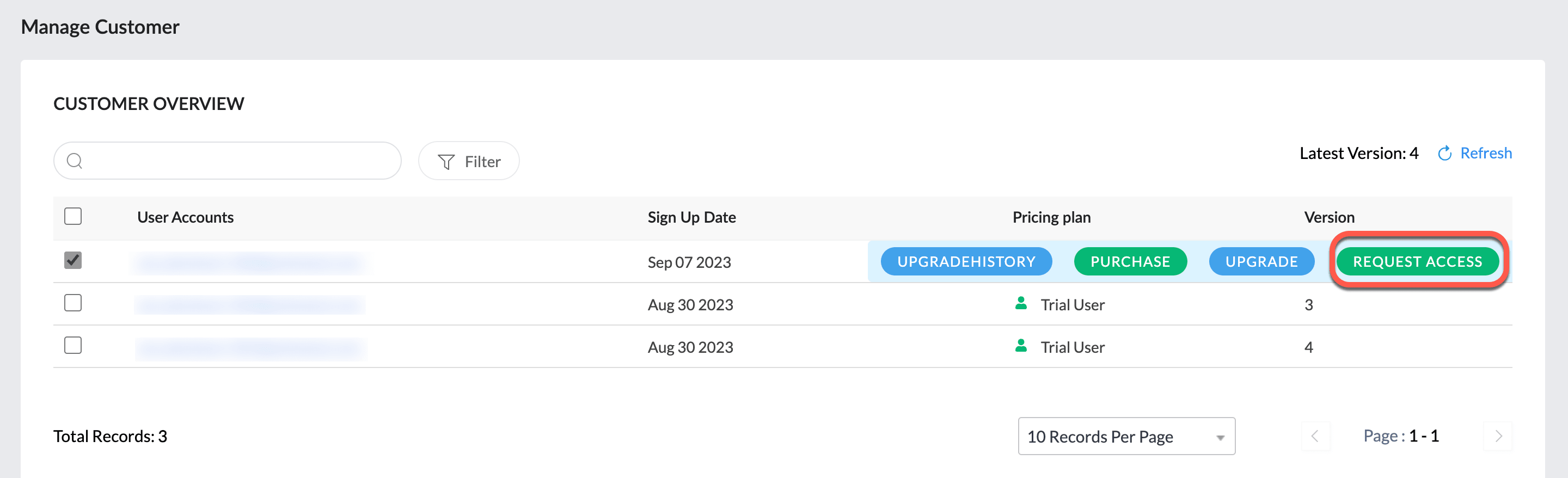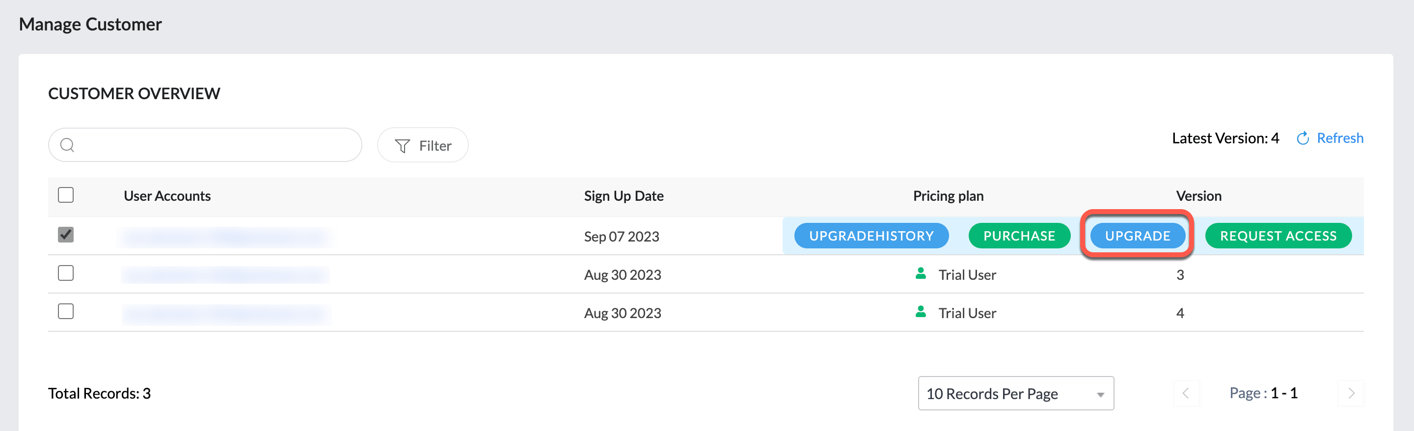 - When you select a customer, you can see the operations that you can perform for that selected customer. The upgrade option will be provided for all the active user accounts. The Upgrade button will be displayed as indicated in the screenshot below.