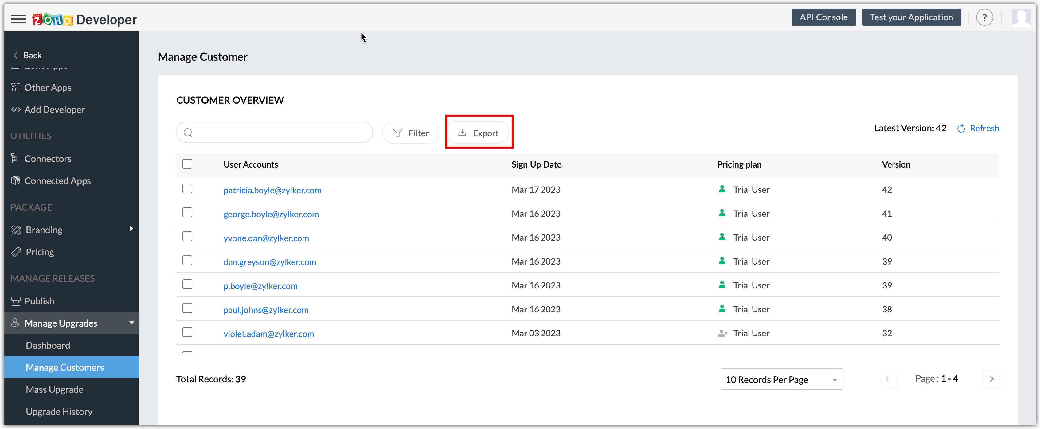 Vertical Solutions allows you to export the customer data of your solutions in csv format from the Manage Customers page. This data can be used for analysis outside the Developer. To export the Customer data, navigate to the Customer Overview page by clicking on Manage Upgrades > Manage Customers.